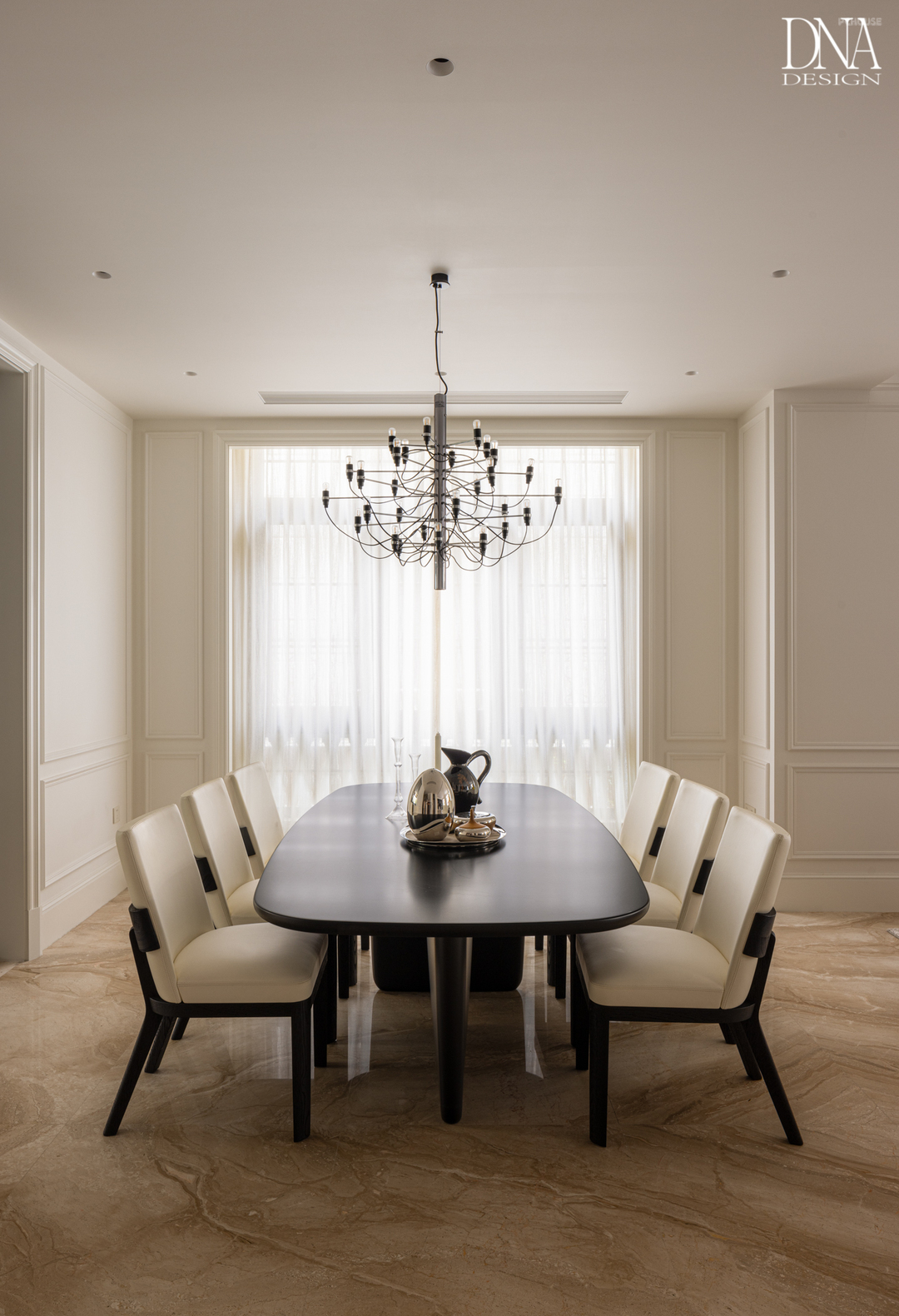 ▼餐厅的椅子来自Liaigre的Robinson,其设计灵感来源于船只,旨在将雕塑木材的力量与精致皮质的优雅相结合,而B&B Italia的Tobi-ishi餐桌灵感来源于石头,其“笨拙”的雕塑感与精致的吊灯、椅子形成一种反差感,我们在设计中非常擅长将不同风格的家具品牌融合。