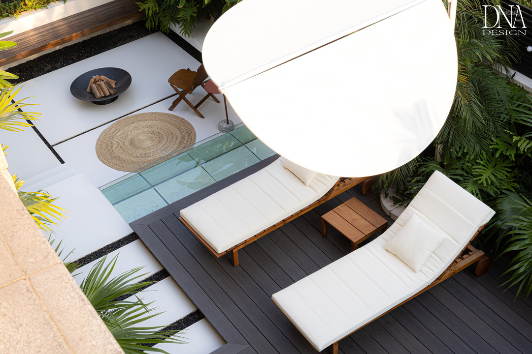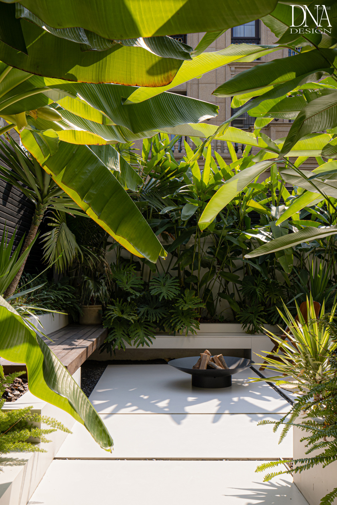 ▼一层花园拥有精心修饰过的人造景观,在这里集合了绿化、水景、篝火等户外功能。