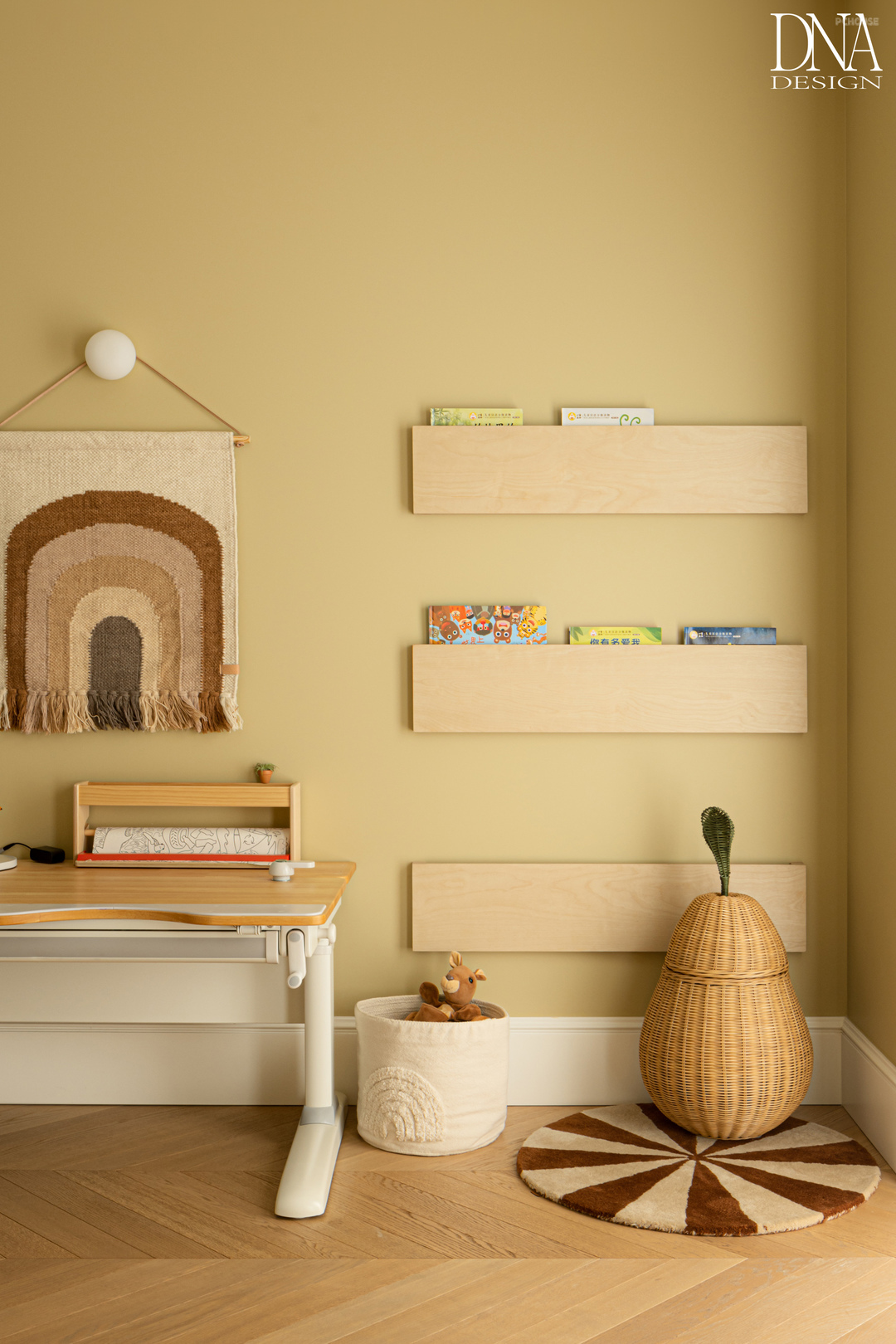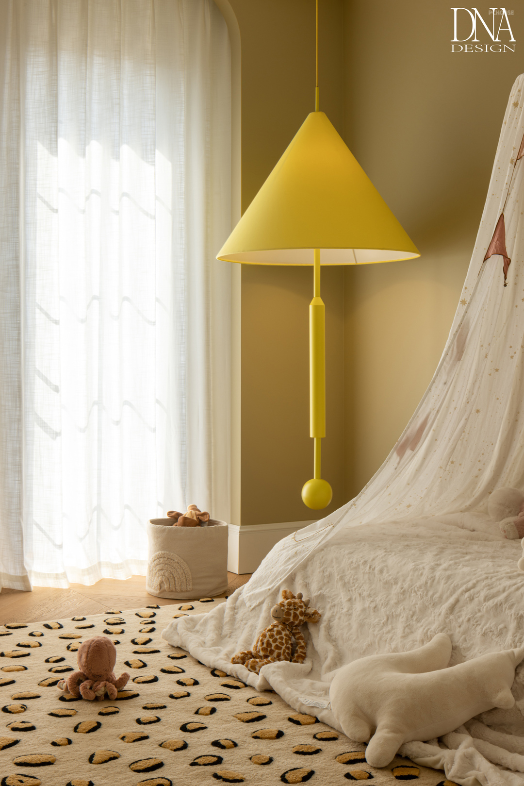 ▼儿童活动房间我们通体使用黄色的涂料滚刷来区分空间的属性,Maison Dada夸张的伞形吊灯点缀颇有童趣,这个品牌的设计总是充满了俏皮和怪诞的风格,颠覆传统审美和既定想法,为空间注入灵感和创意。