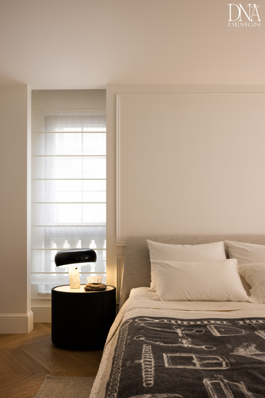 二层卧室为营造更纯净的休息空间,我们在墙体预埋了Flos的Abajourd'hui系列灯具作为点缀,独特的设计让它仅仅通过光影的轮廓来表达它的存在,同时通过扩散的光线来营造宁静的环境。