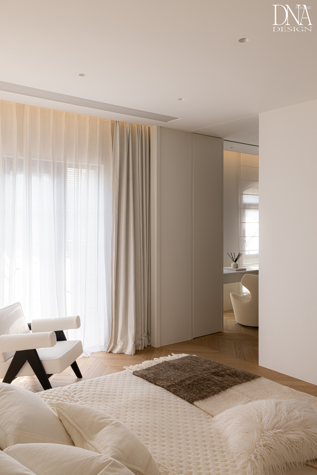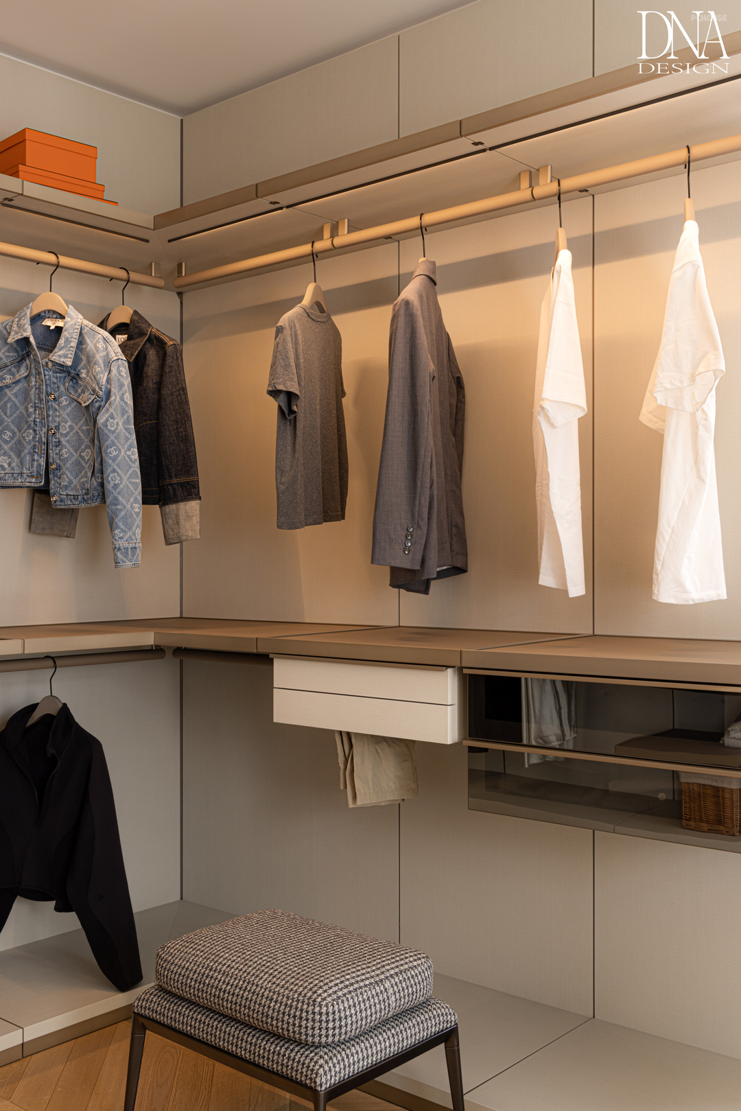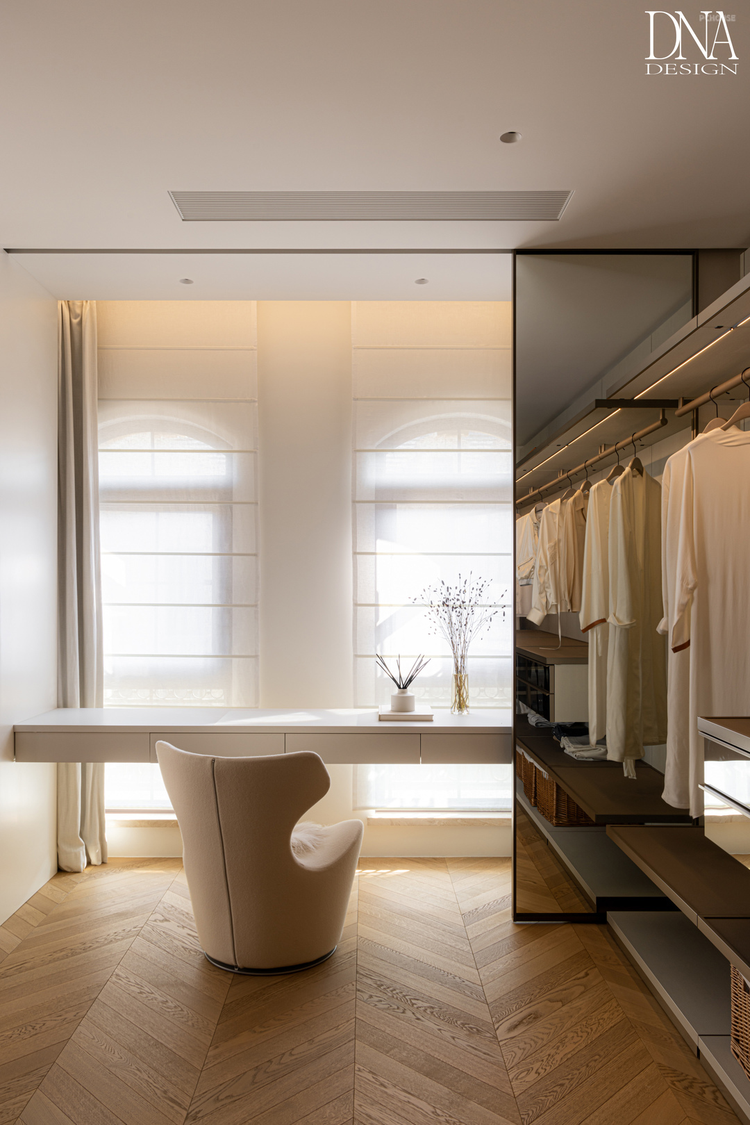 The cloakroom storage system comes from Poliform, and its excellent quality adds a sense of refinement to the space. We pre-embedded slide rails at the top and hid a movable mirror on one side of the wall to visually increase the visual depth of the wardrobe. It can be pulled out to be used as a full-length mirror when necessary.