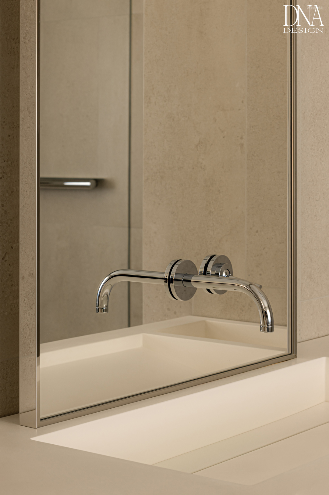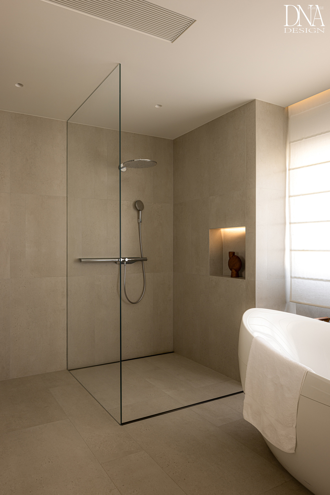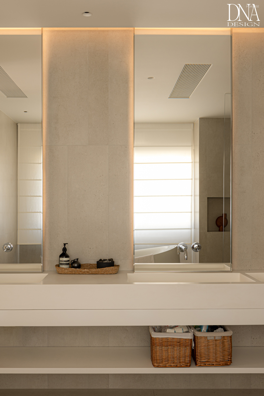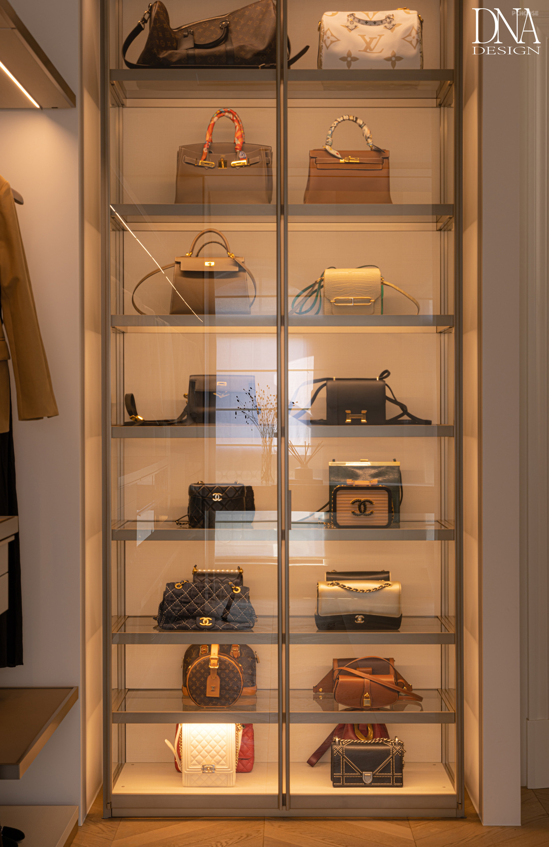The cloakroom storage system comes from Poliform, and its excellent quality adds a sense of refinement to the space. We pre-embedded slide rails at the top and hid a movable mirror on one side of the wall to visually increase the visual depth of the wardrobe. It can be pulled out to be used as a full-length mirror when necessary.