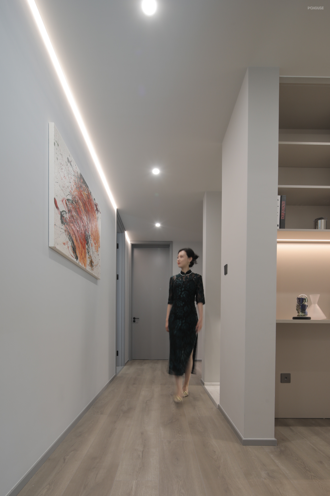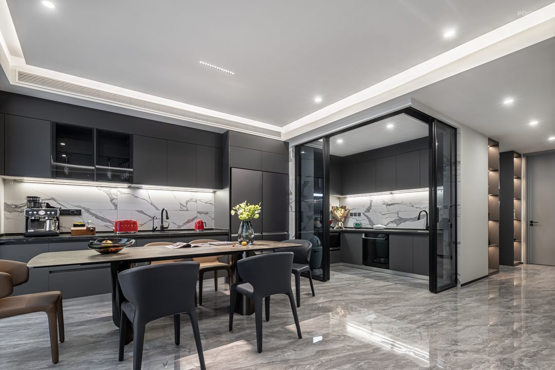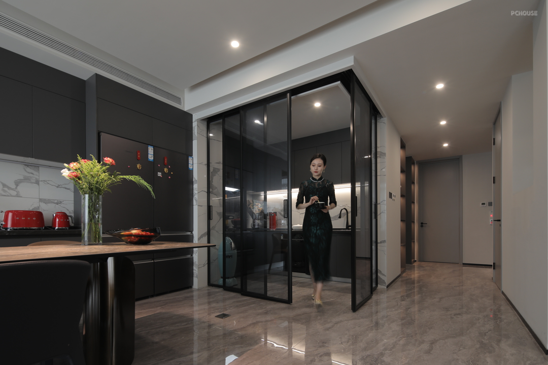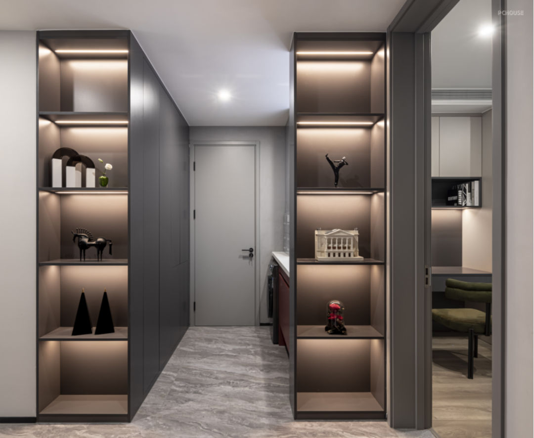以深灰与白色搭配,多处设置收纳柜体,流畅的线条勾勒出秩序的美感,同时兼顾生活实用功能,收纳柜放置各种装饰摆件,存满了对家的热爱,让回家的人感到舒适与温暖。