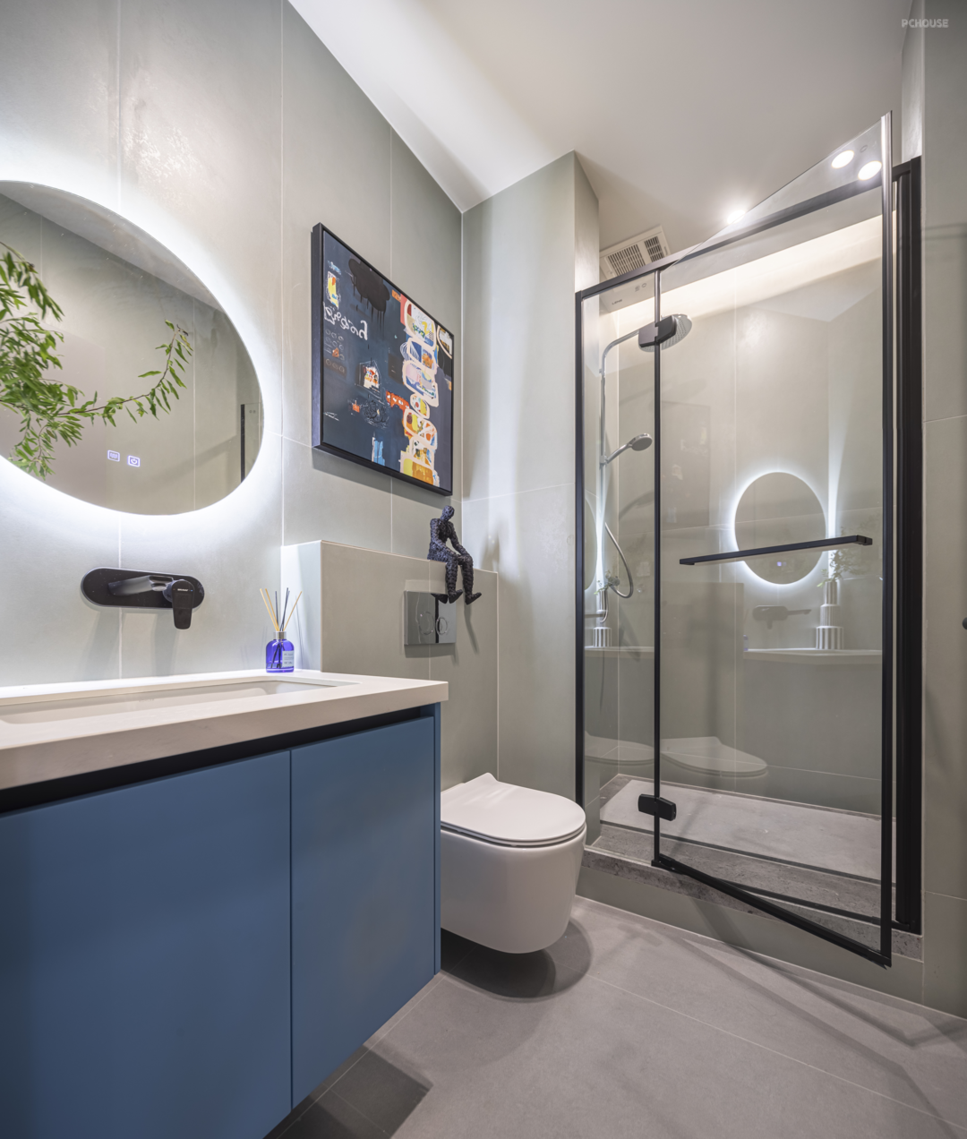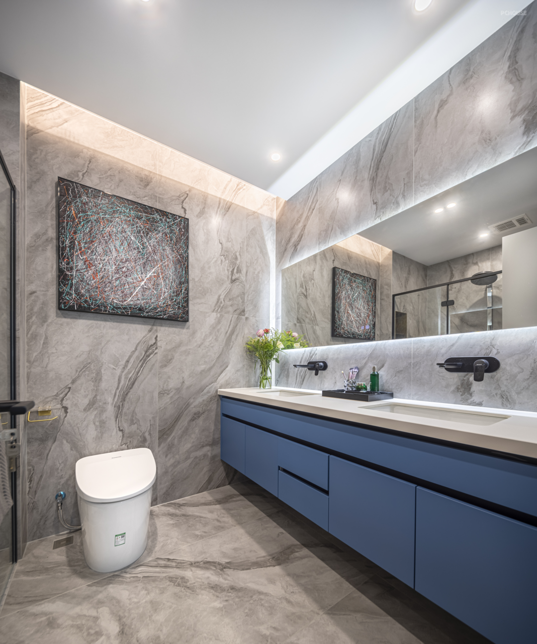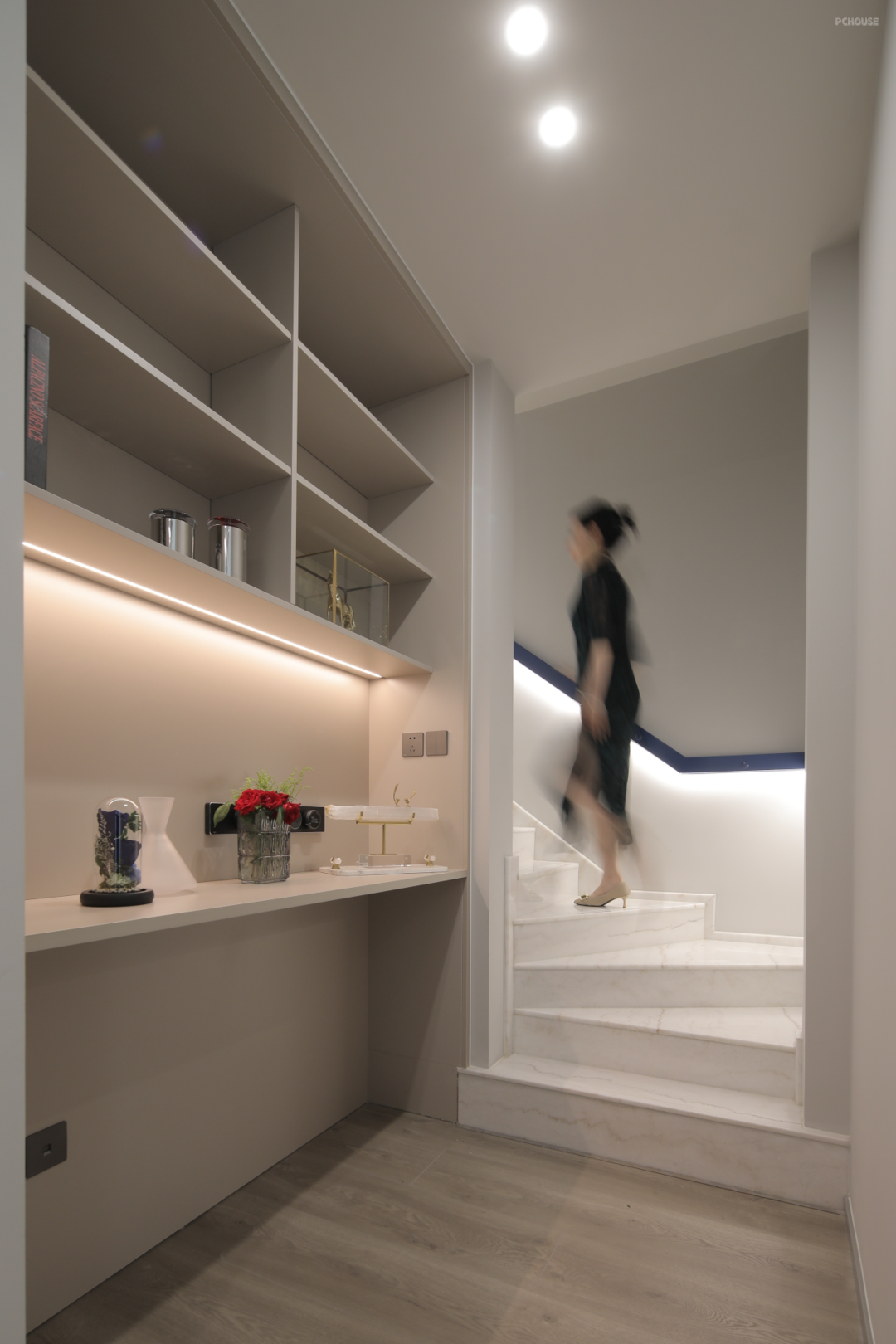 以深灰与白色搭配,多处设置收纳柜体,流畅的线条勾勒出秩序的美感,同时兼顾生活实用功能,收纳柜放置各种装饰摆件,存满了对家的热爱,让回家的人感到舒适与温暖。