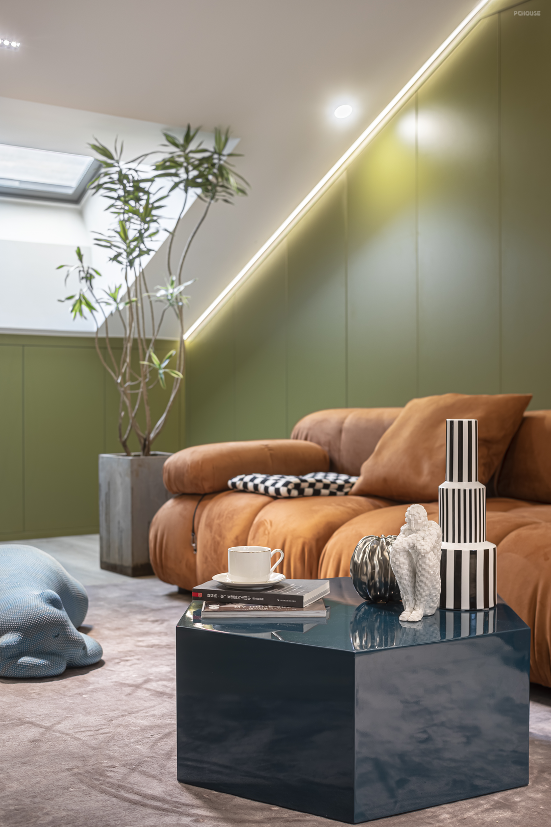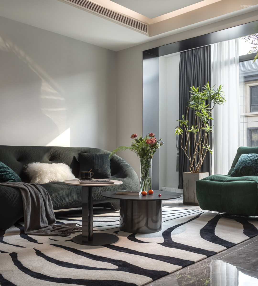经典的斑马条纹地毯被运用到客厅里,加深空间深邃感的同时,也保持了视觉的协调统一性,色块与线条相互衔接组合,增强了空间的立体层次,静静铺述出简约理性的空间氛围