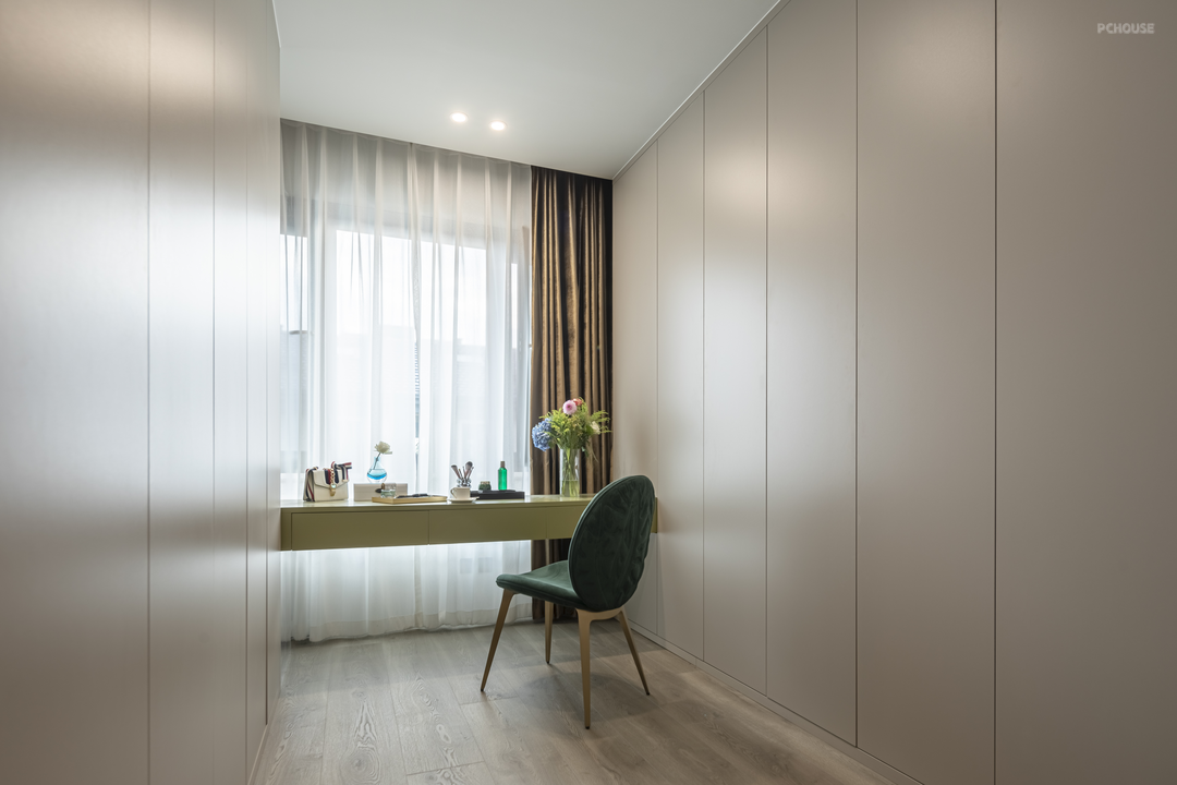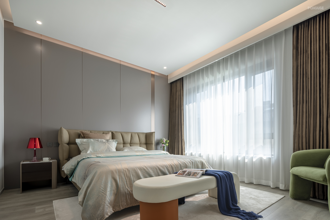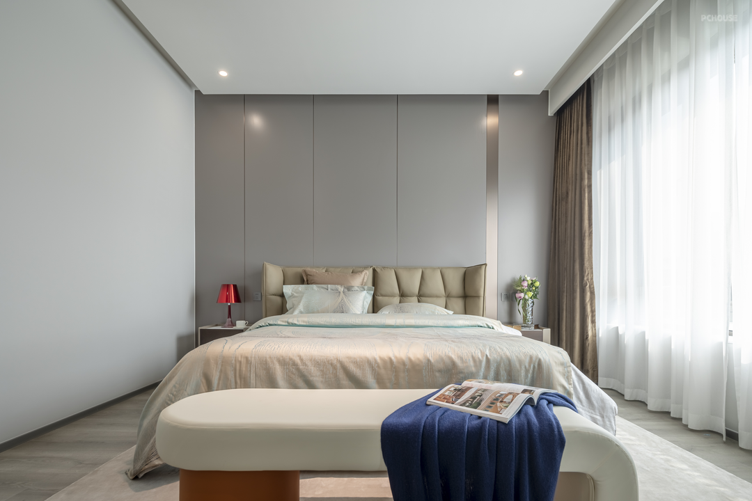 以静谧和爱意为主题,铺就的卧室温暖又不失雅性,浅灰色的地板和奶油色的墙面相辅相成,溢出卧室的暖意和浪漫,表达出屋主对生活平静自由的向往。