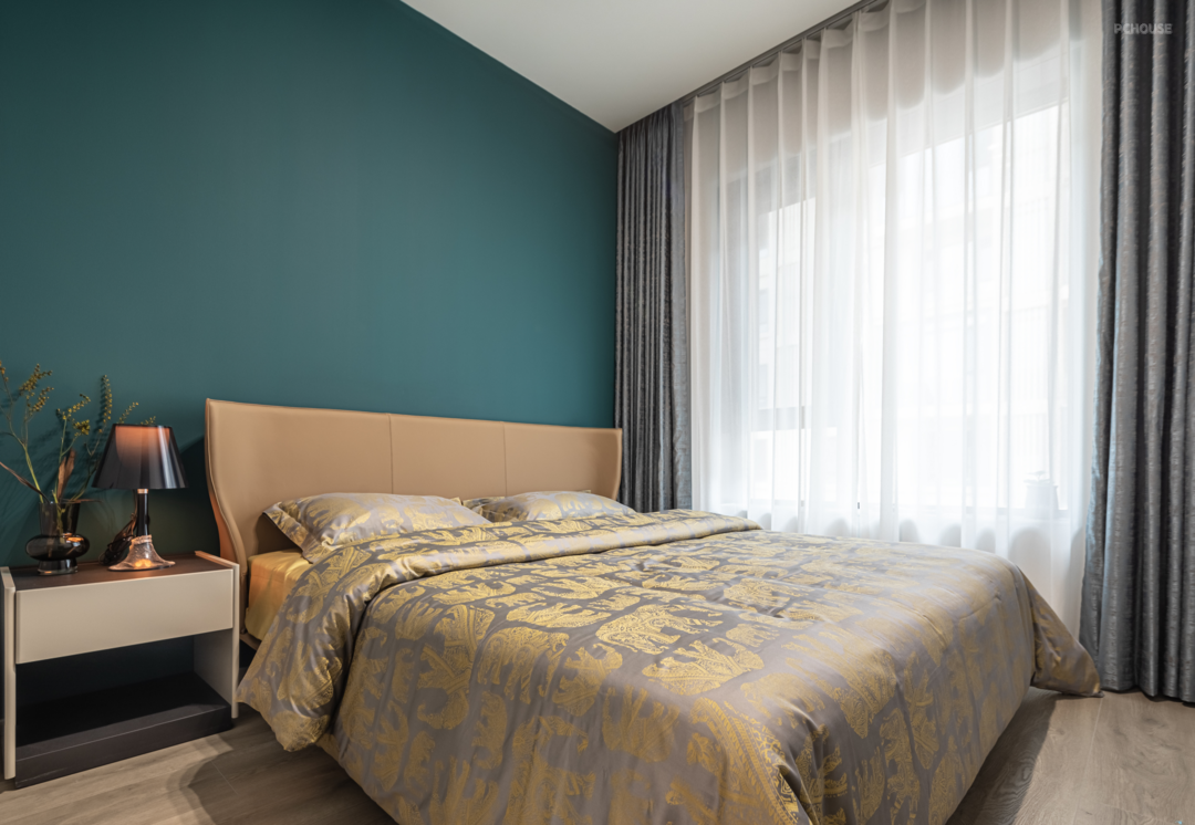 卧室摒弃繁杂的装饰,带人回归到简约与宁静之中,墨绿色的背景墙搭配两盏艺术灯饰,为空间注入一丝复古格调,纱幔摇曳让窗外的绿意若隐若现,将自然韵律引入室内,让生活回归到自然艺术当中。