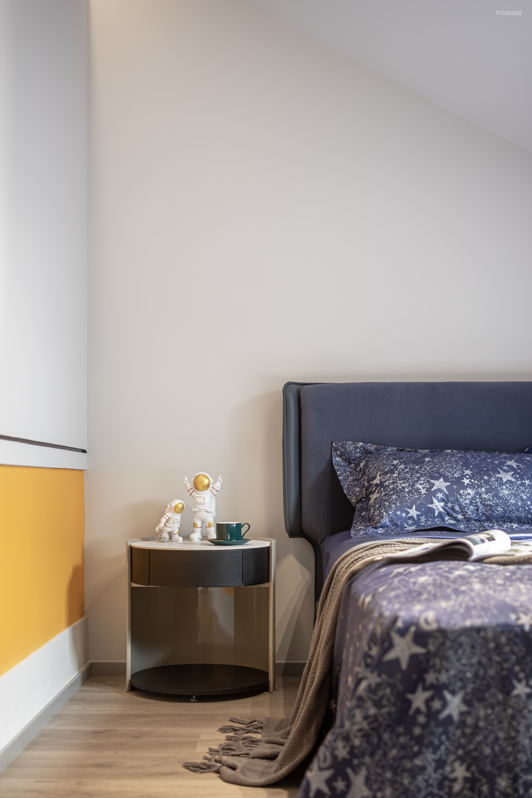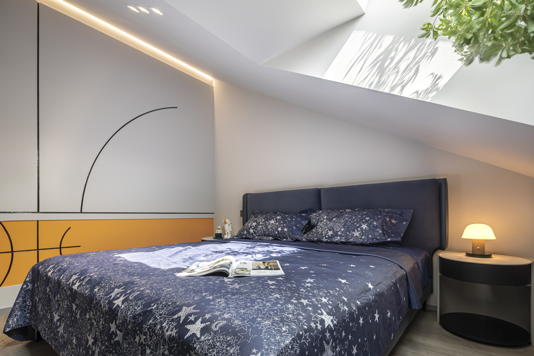 男孩房继续沿用简雅的色调,营造静谧舒适的氛围感,墙面上的斑驳光影,让自然的意蕴融入空间,将想象引领到广阔的天地。