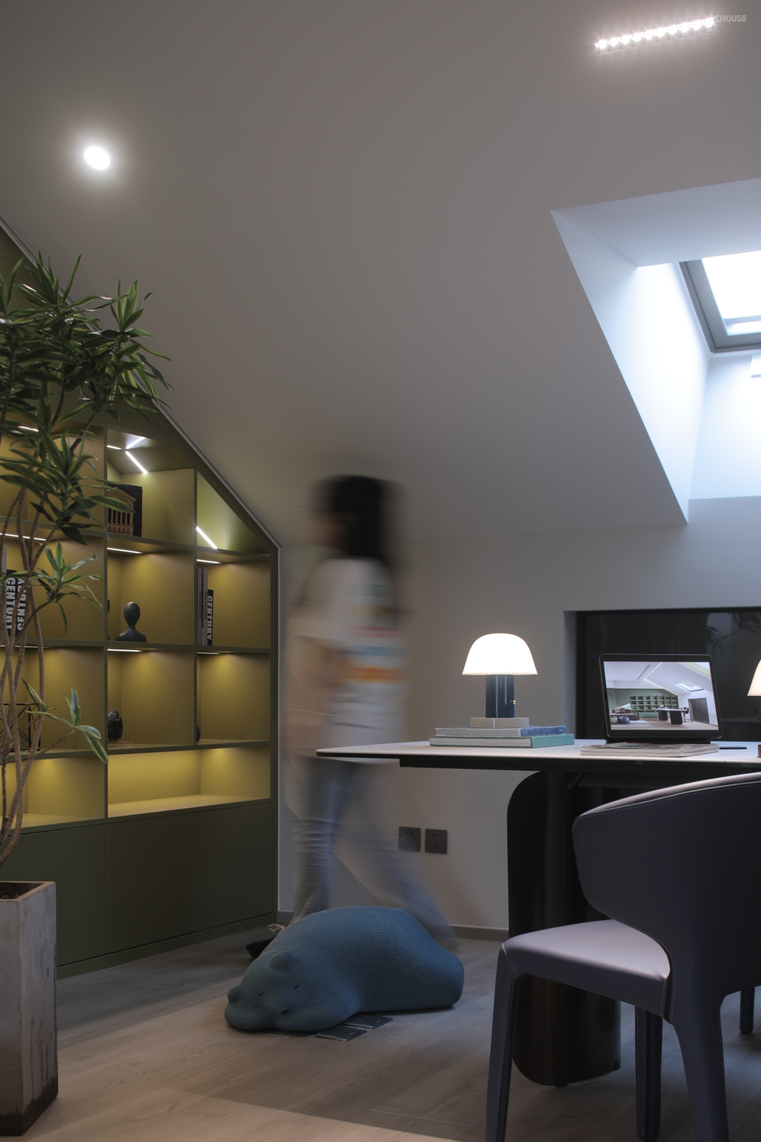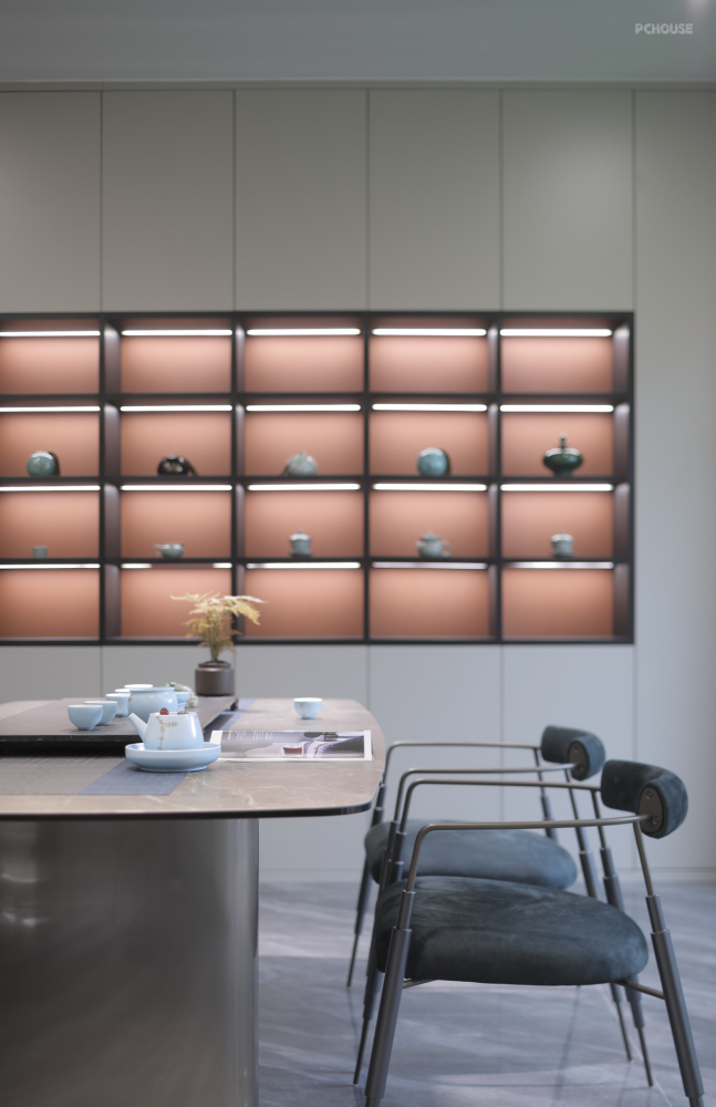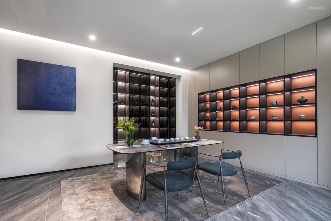 平静安宁,清雅舒适,柜墙摆放了屋主喜爱的物件,将生活记忆引入别墅设计空间,牵动人、物、景以及空间的互动,闲来时独坐茶室,书籍与清茶相伴,回归纯真本质的生活状态。