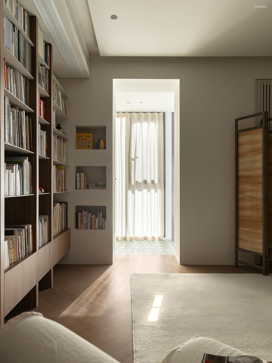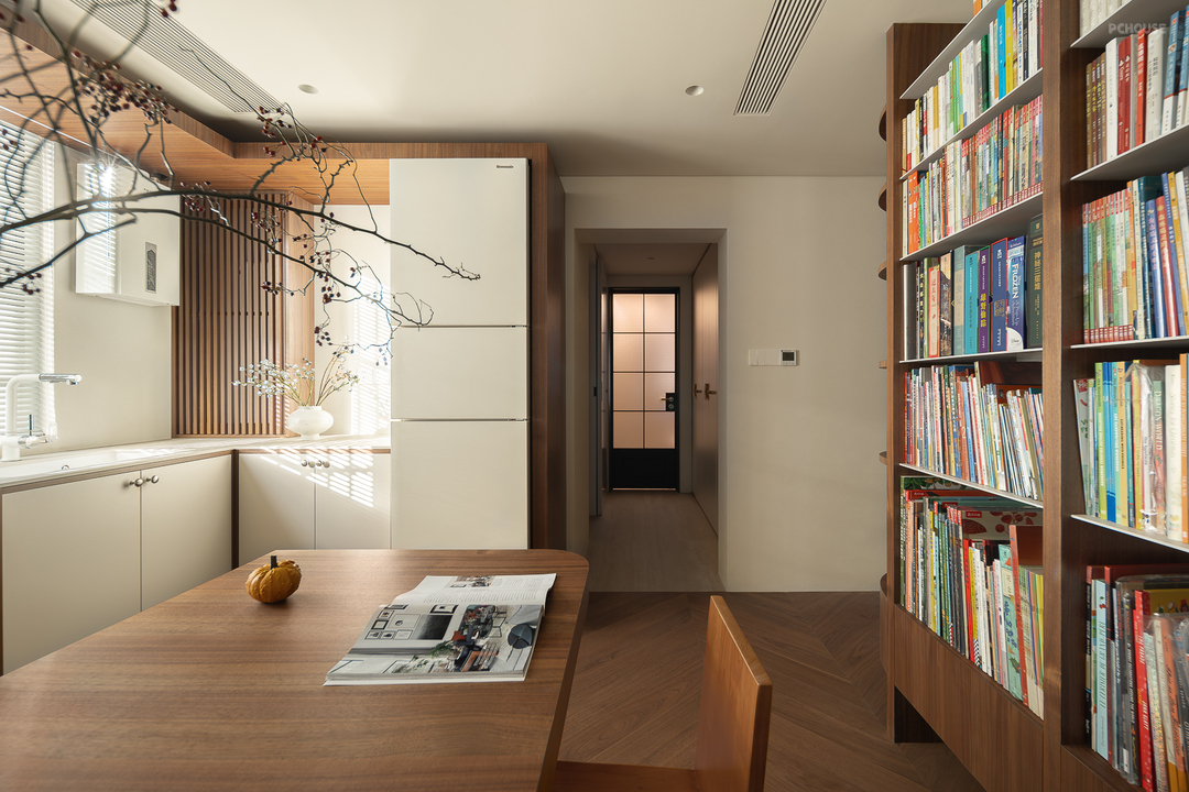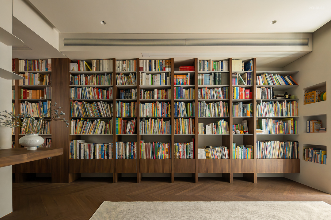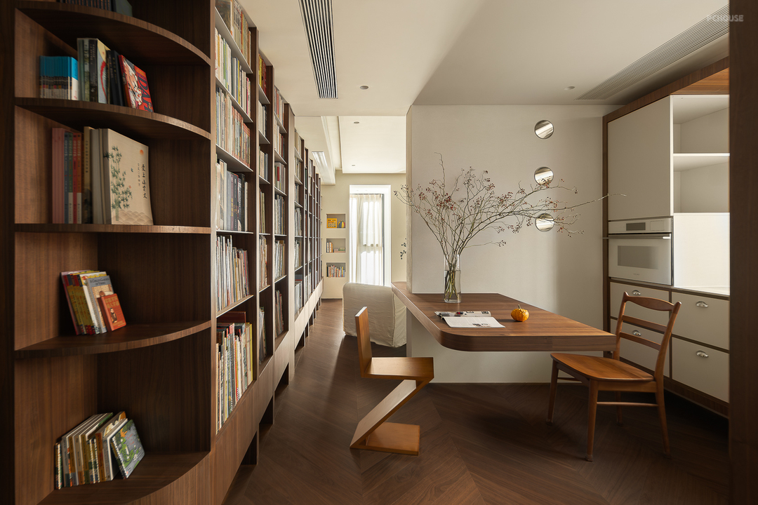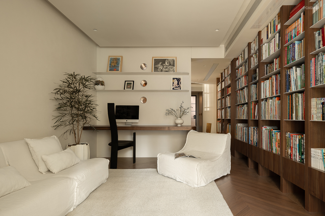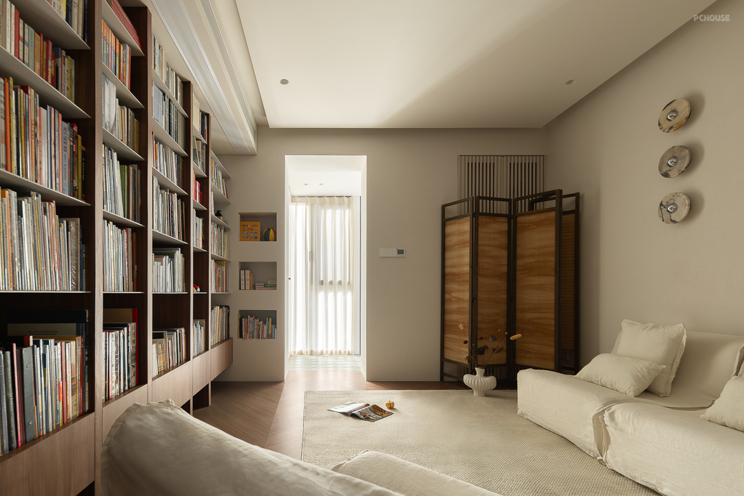 客厅由原本的主卧室改造而来,客户希望把这里作为小朋友的玩耍区,空间尽量开放,不要茶几,电视也取消由投影布代替。 需要满墙的书柜用来收纳家里面的书籍收藏,满墙书柜不仅仅是木材与书籍的堆砌,它是一座智慧的宝库,是灵感的源泉。无论你身处何地,何时翻开书页,都能感受到时间缝隙中流淌的温柔。