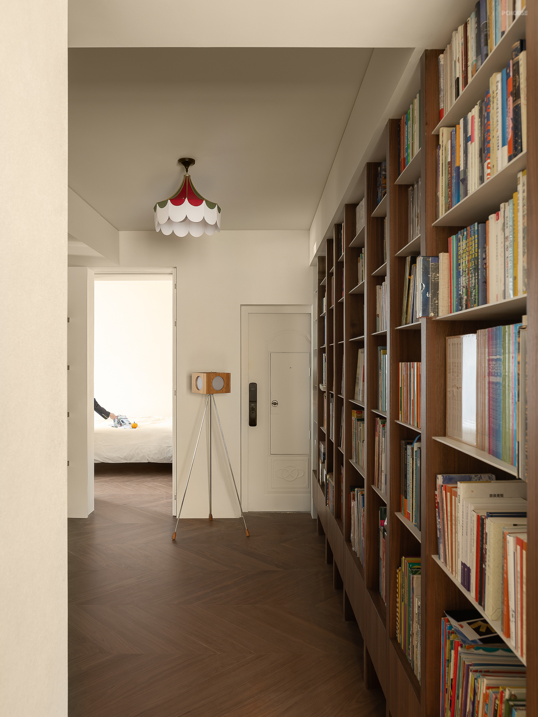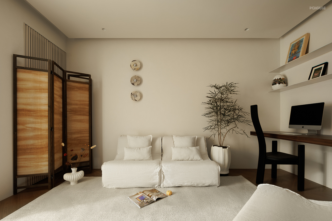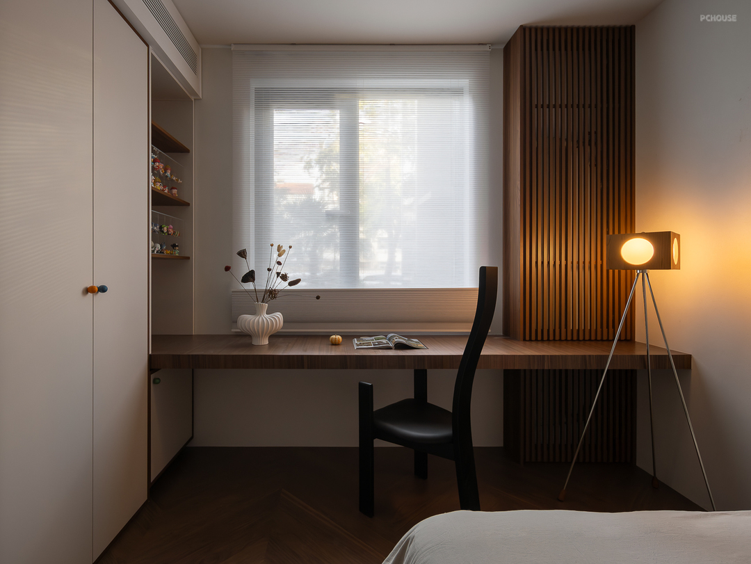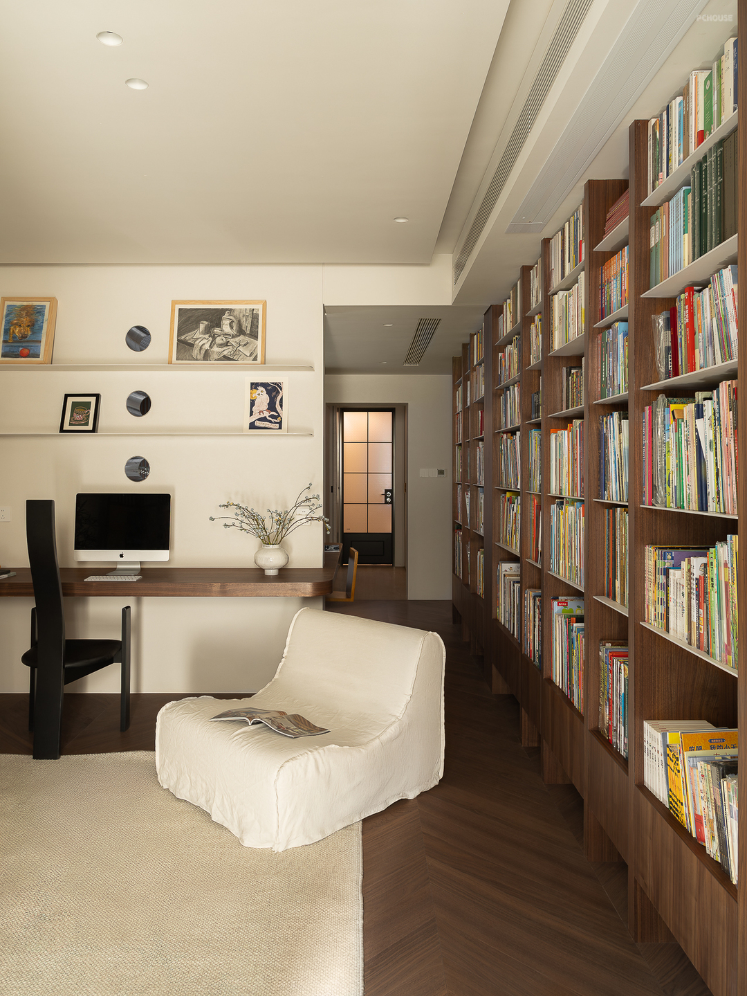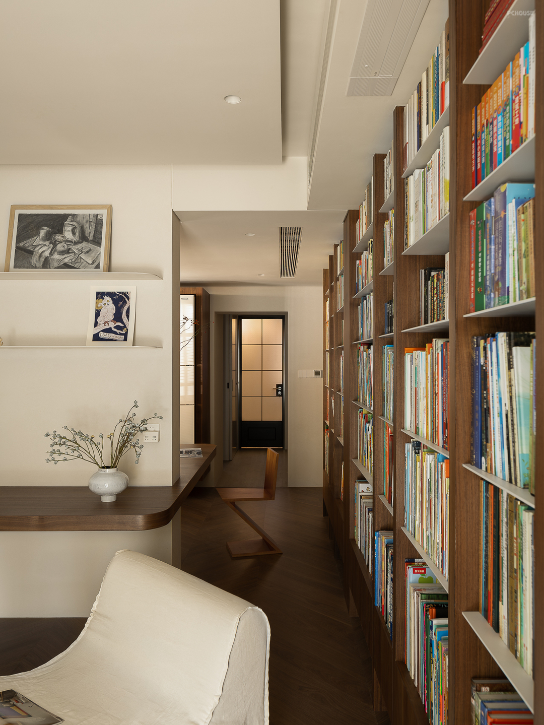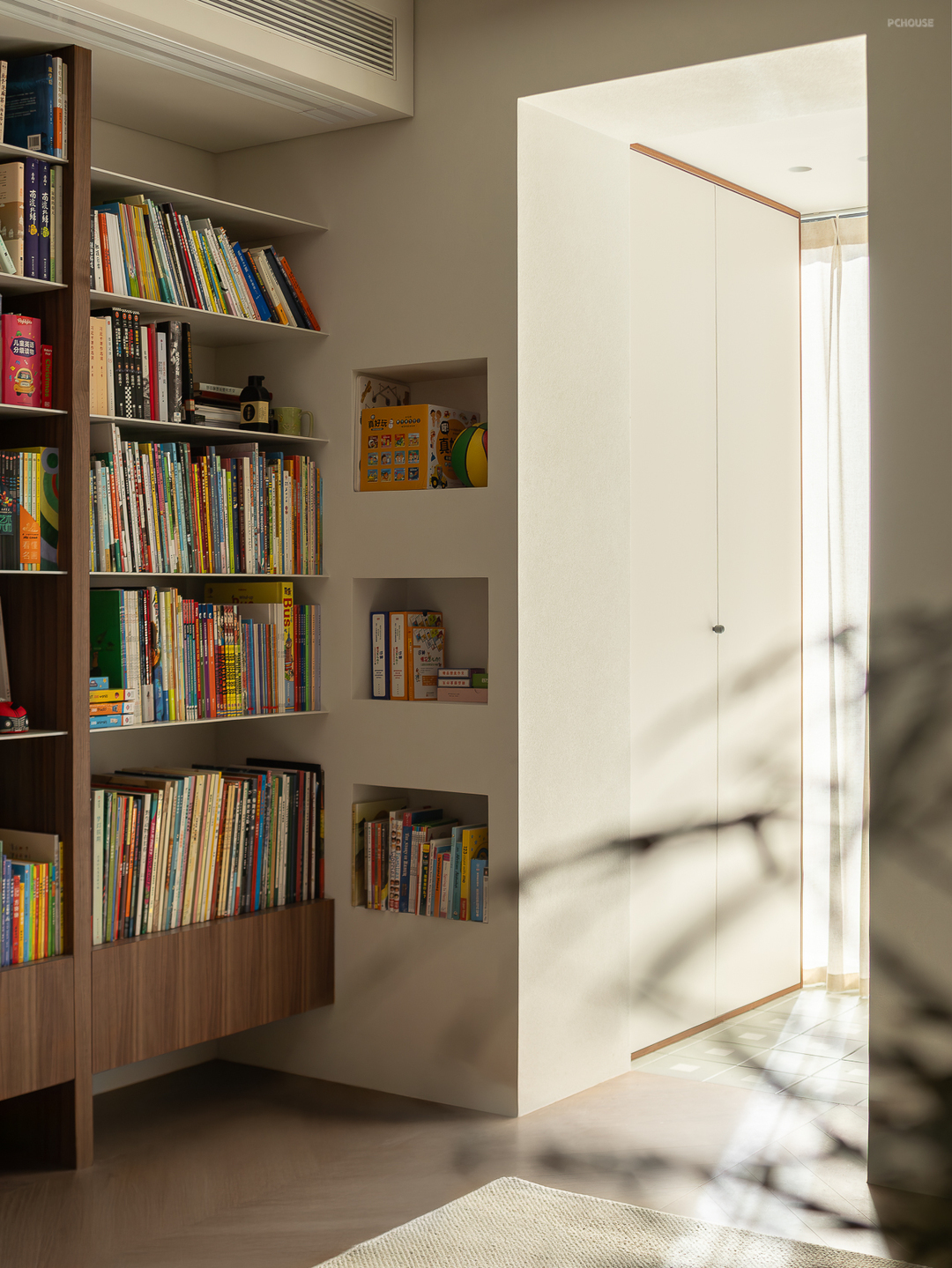 客厅由原本的主卧室改造而来,客户希望把这里作为小朋友的玩耍区,空间尽量开放,不要茶几,电视也取消由投影布代替。 需要满墙的书柜用来收纳家里面的书籍收藏,满墙书柜不仅仅是木材与书籍的堆砌,它是一座智慧的宝库,是灵感的源泉。无论你身处何地,何时翻开书页,都能感受到时间缝隙中流淌的温柔。