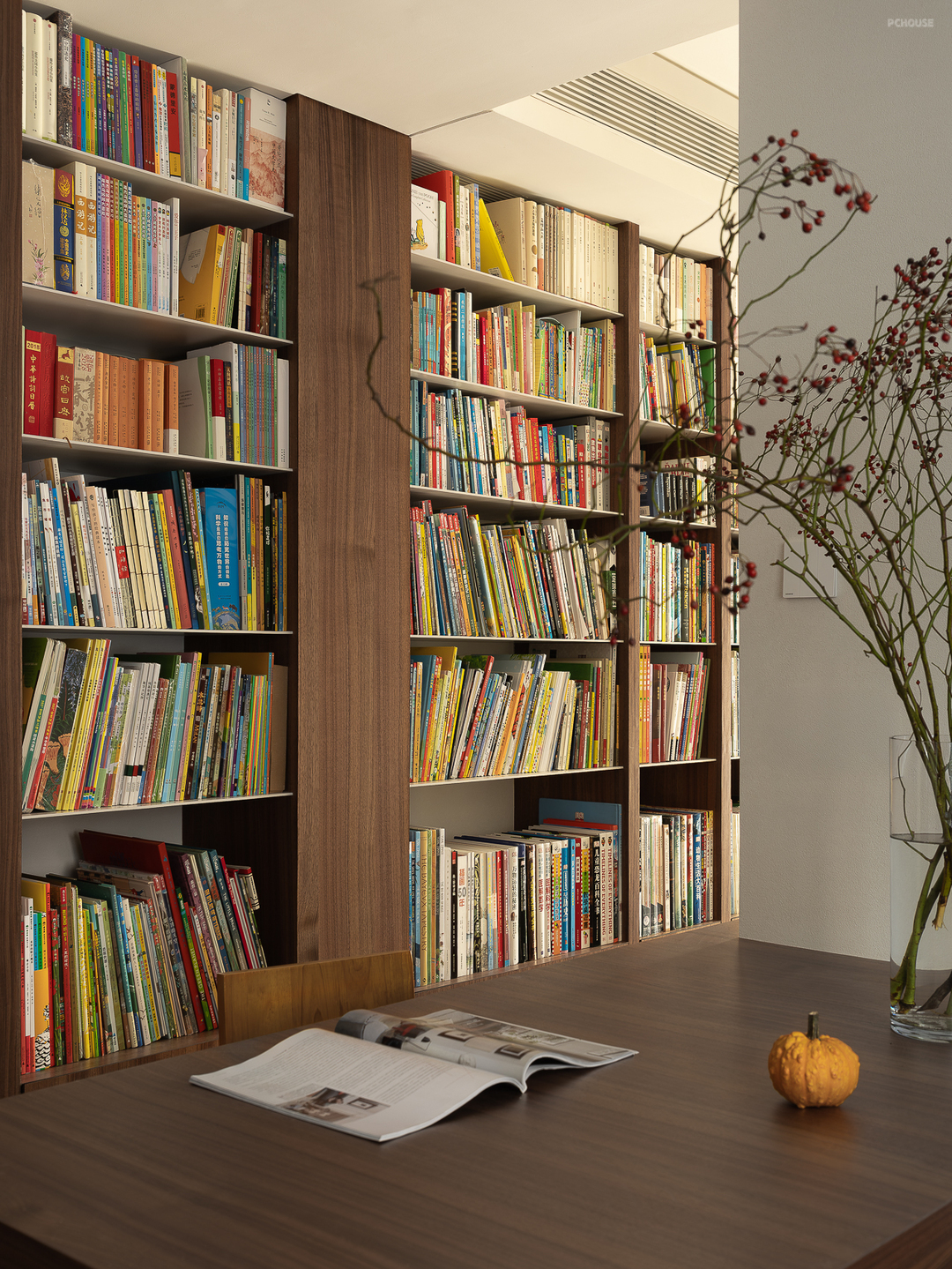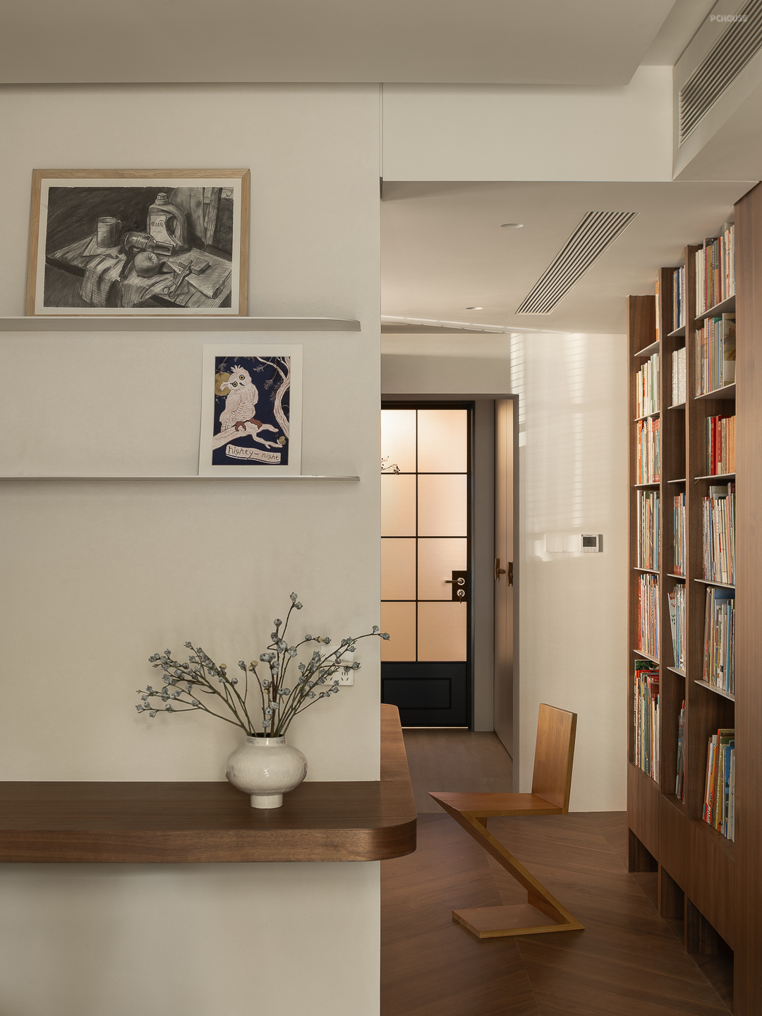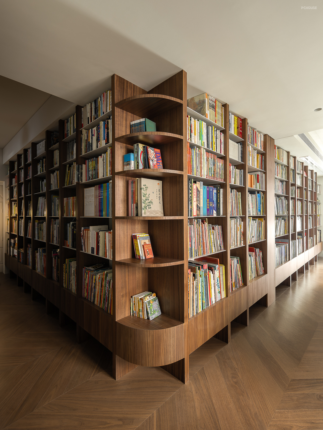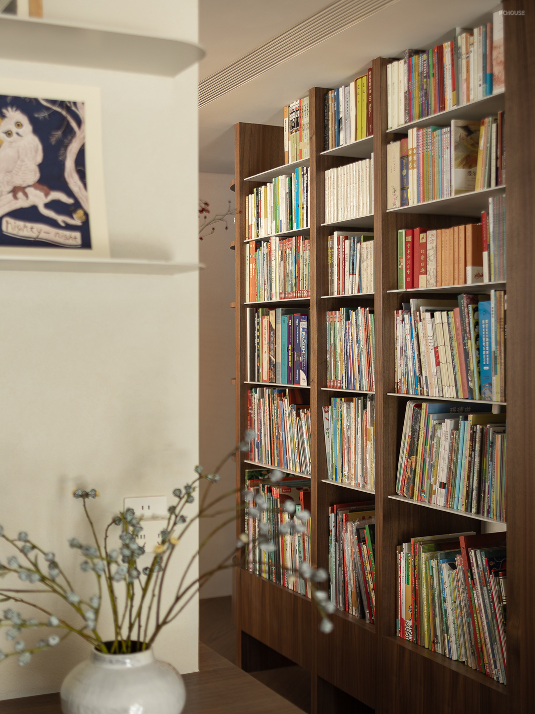 客厅由原本的主卧室改造而来,客户希望把这里作为小朋友的玩耍区,空间尽量开放,不要茶几,电视也取消由投影布代替。 需要满墙的书柜用来收纳家里面的书籍收藏,满墙书柜不仅仅是木材与书籍的堆砌,它是一座智慧的宝库,是灵感的源泉。无论你身处何地,何时翻开书页,都能感受到时间缝隙中流淌的温柔。