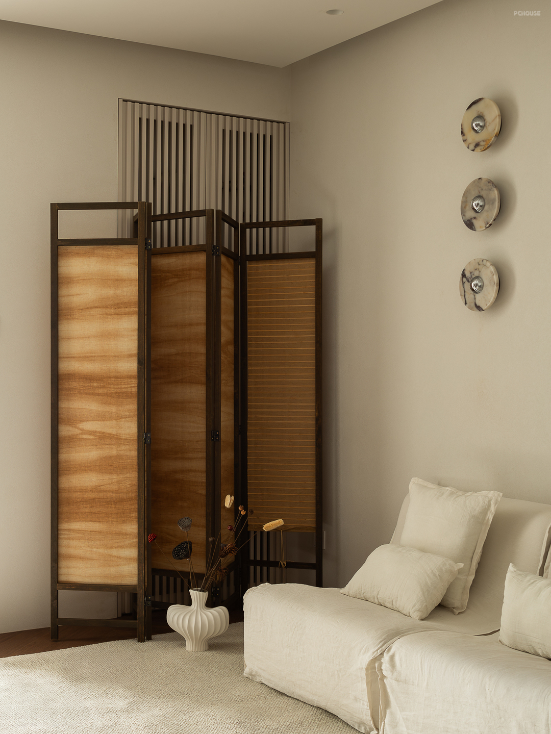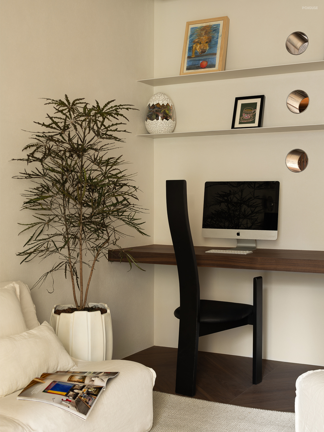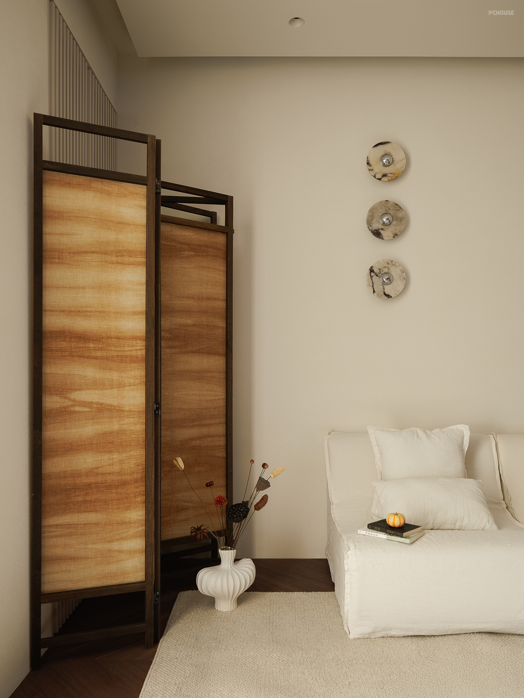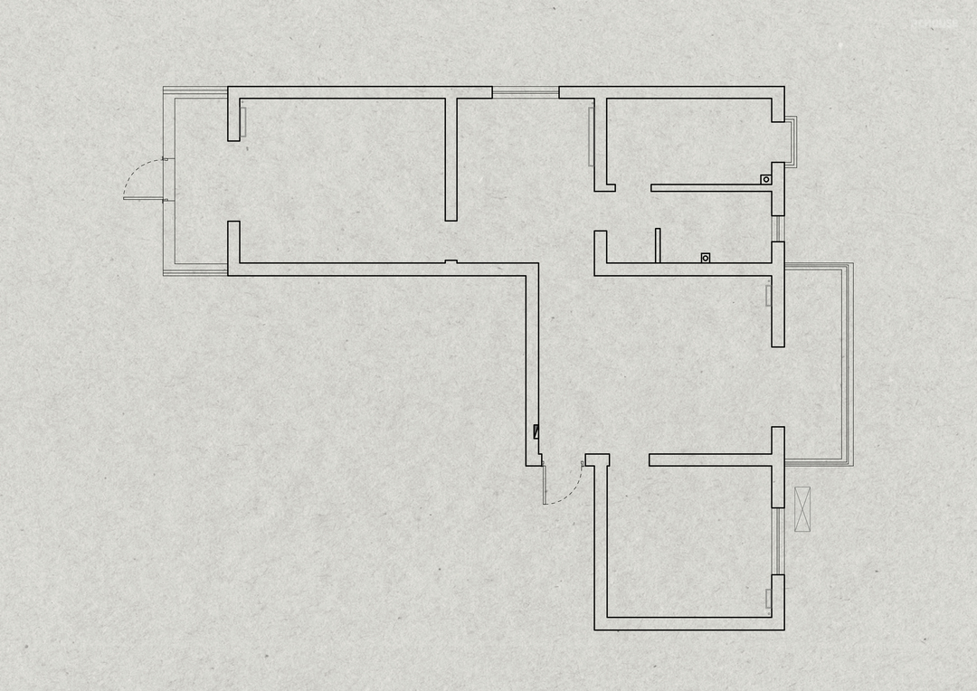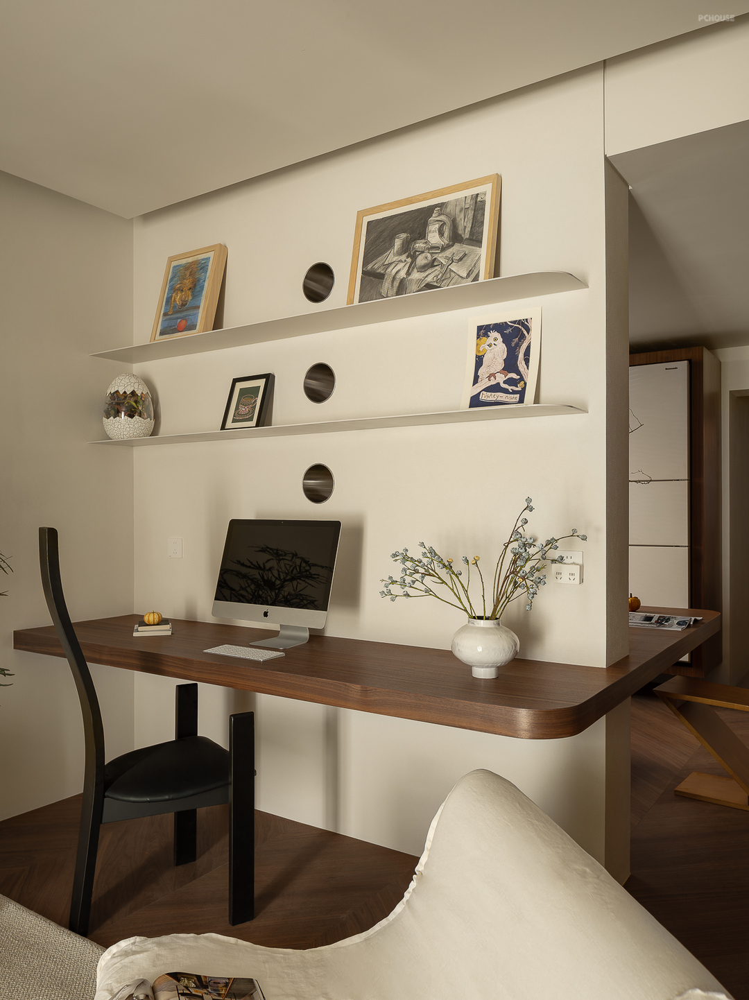 客厅由原本的主卧室改造而来,客户希望把这里作为小朋友的玩耍区,空间尽量开放,不要茶几,电视也取消由投影布代替。 需要满墙的书柜用来收纳家里面的书籍收藏,满墙书柜不仅仅是木材与书籍的堆砌,它是一座智慧的宝库,是灵感的源泉。无论你身处何地,何时翻开书页,都能感受到时间缝隙中流淌的温柔。