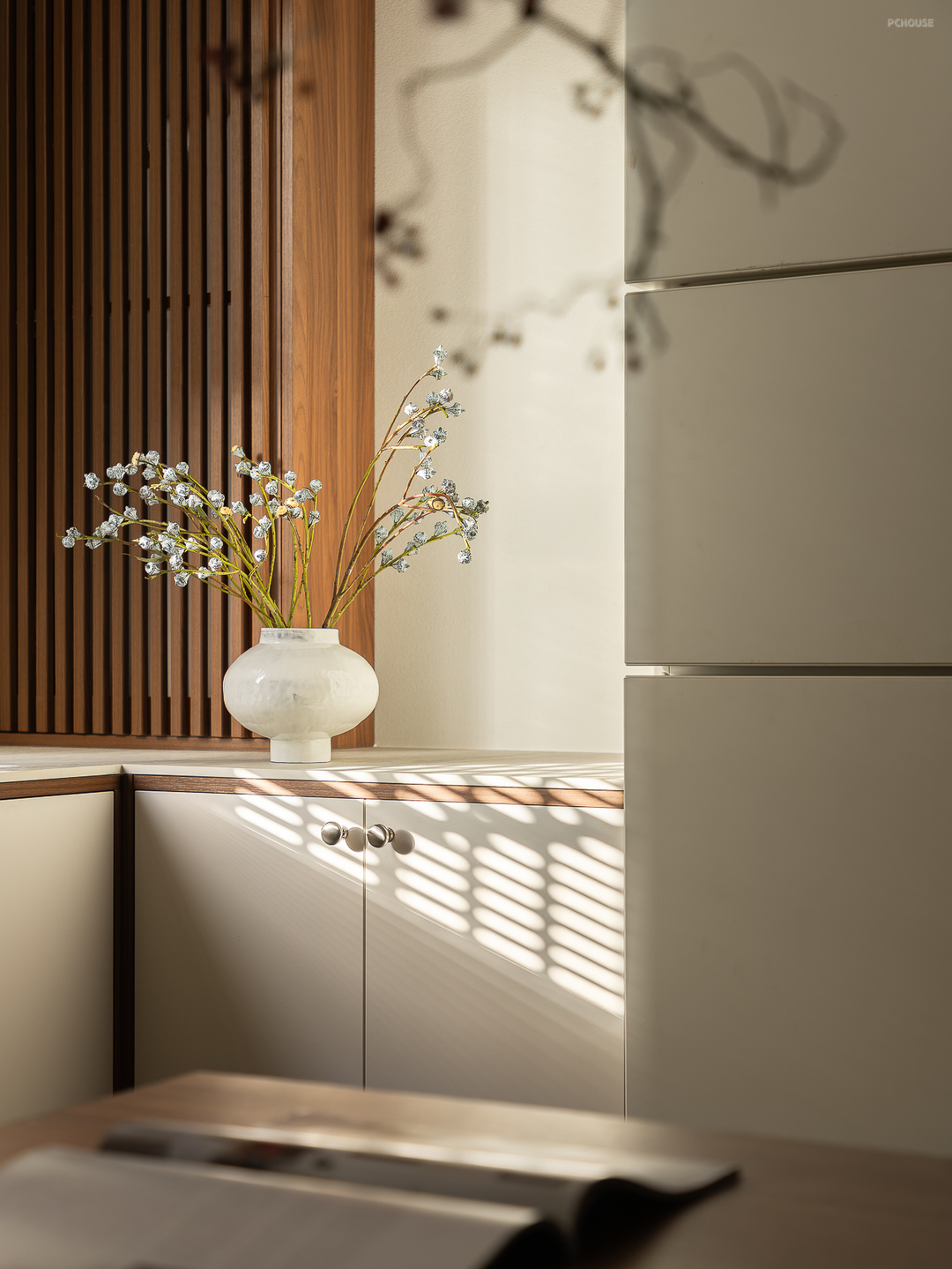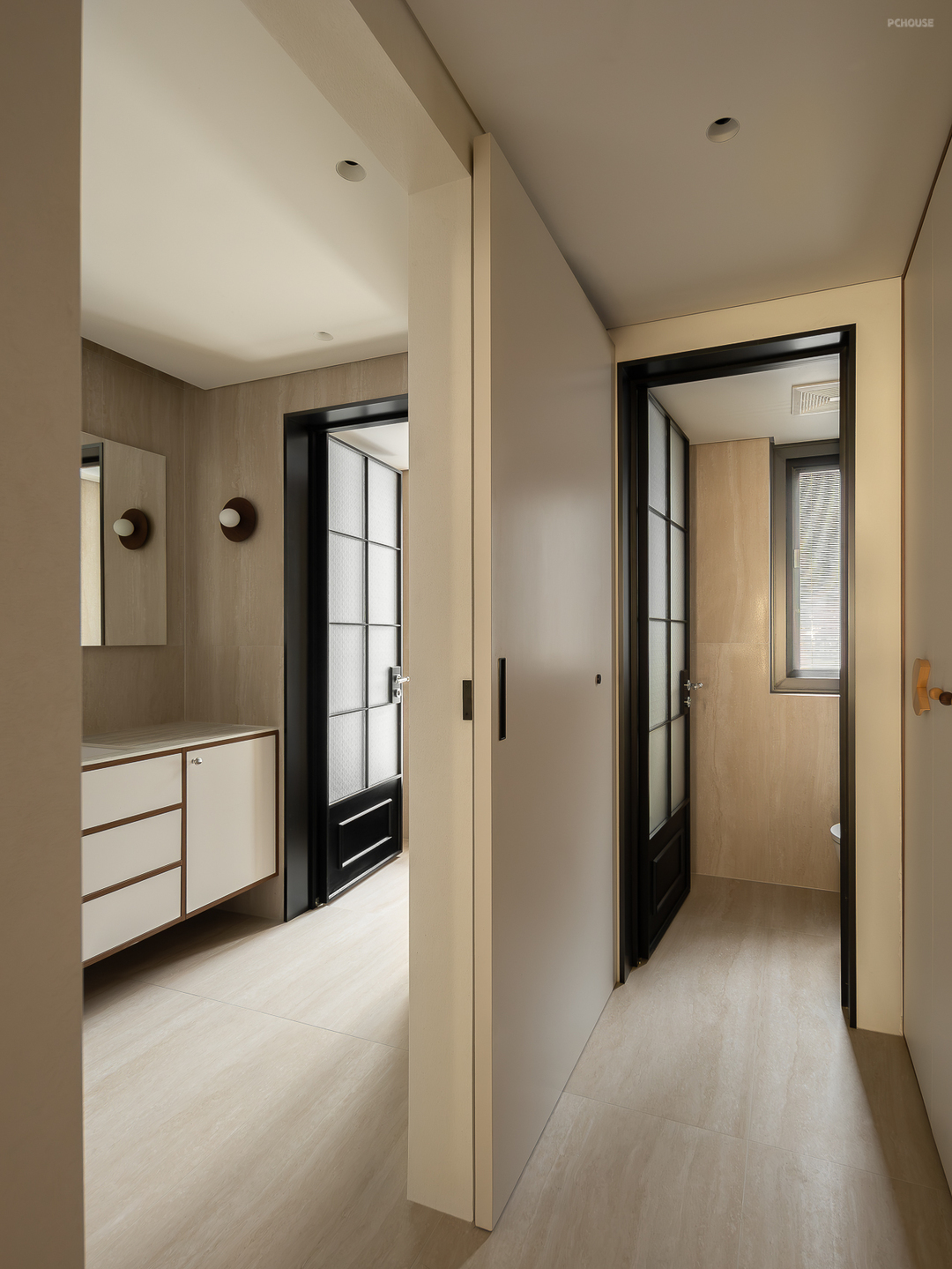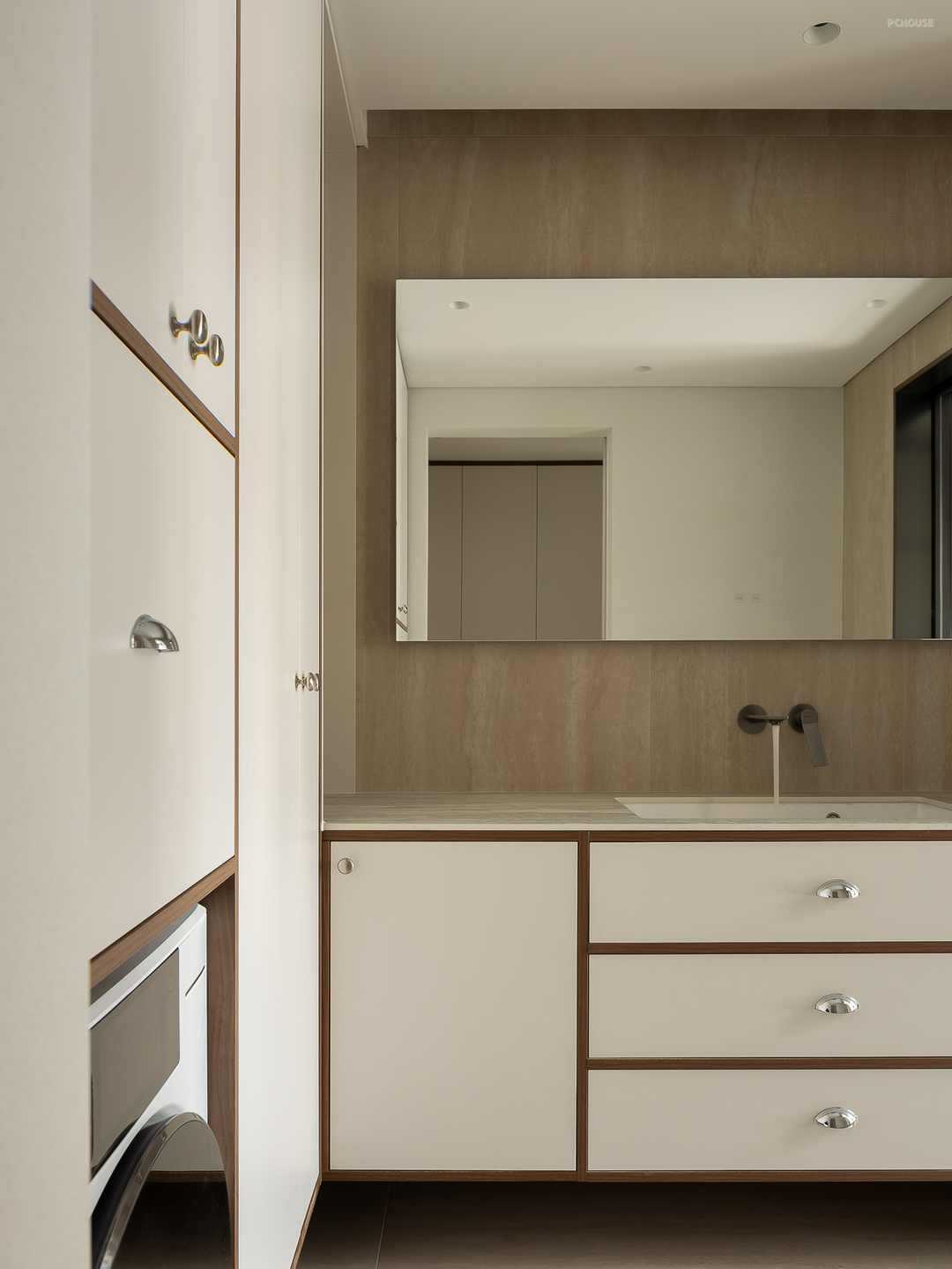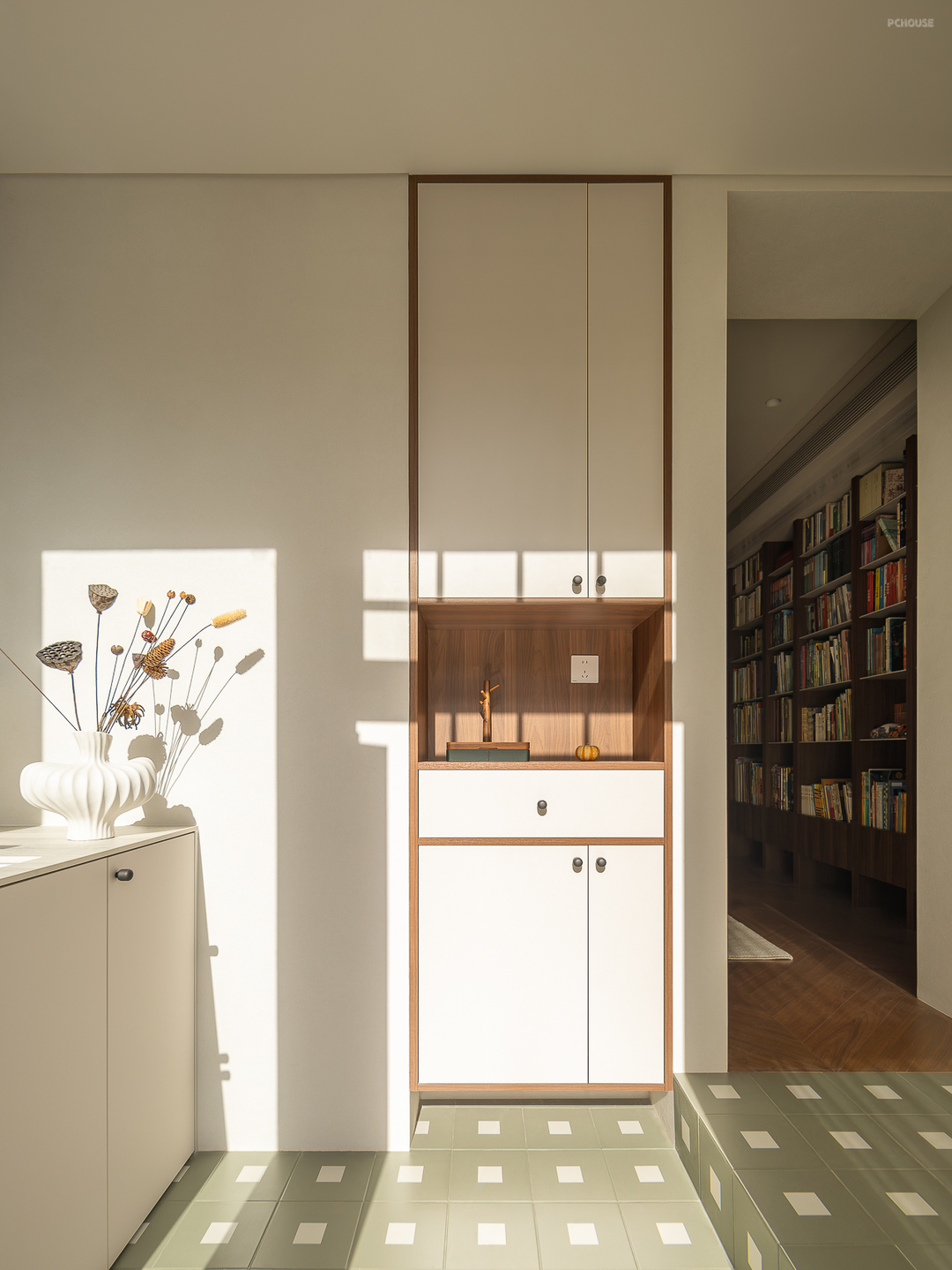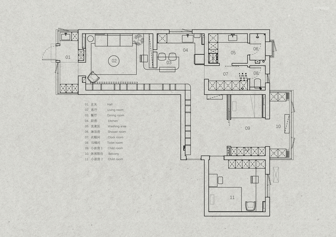 本案是一楼带院子的户型,我们更改了入户的位置,封闭了原始入户门,从院子进入室内,把原始的南阳台改造成玄关。 玄关处我们做了下沉处理,设计了一个落尘区,作为室内外的过渡空间,也能有效阻隔灰尘。人自然而然地就会坐下换鞋,把户外鞋留在落尘区。同时在落尘区设置了一个洗手池,在后疫情时代,让孩子养成回家后”勤洗手“的好习惯。玄关正面也设计了一组临时鞋柜,方便日常鞋子,钥匙等收纳。 最后在玄关的另一侧设计了一组”800库“的转角收纳柜,用来做”次净衣区“解决归家后的衣物、行李、快递、杂物等收纳,然后用一个折叠移门隔开。