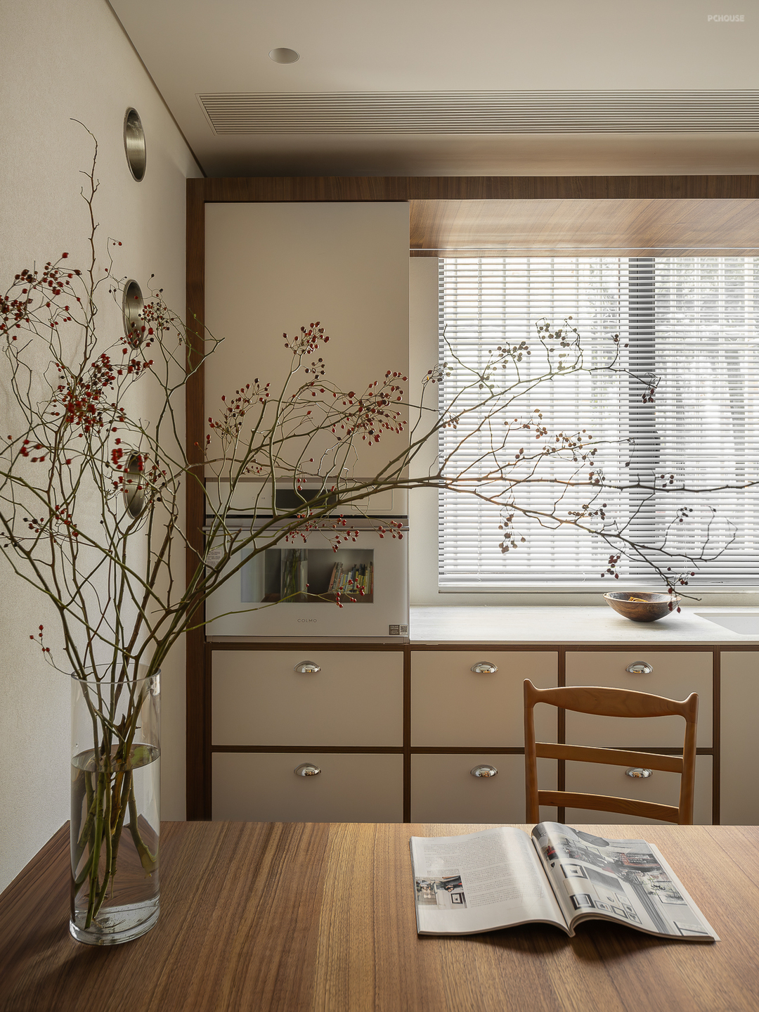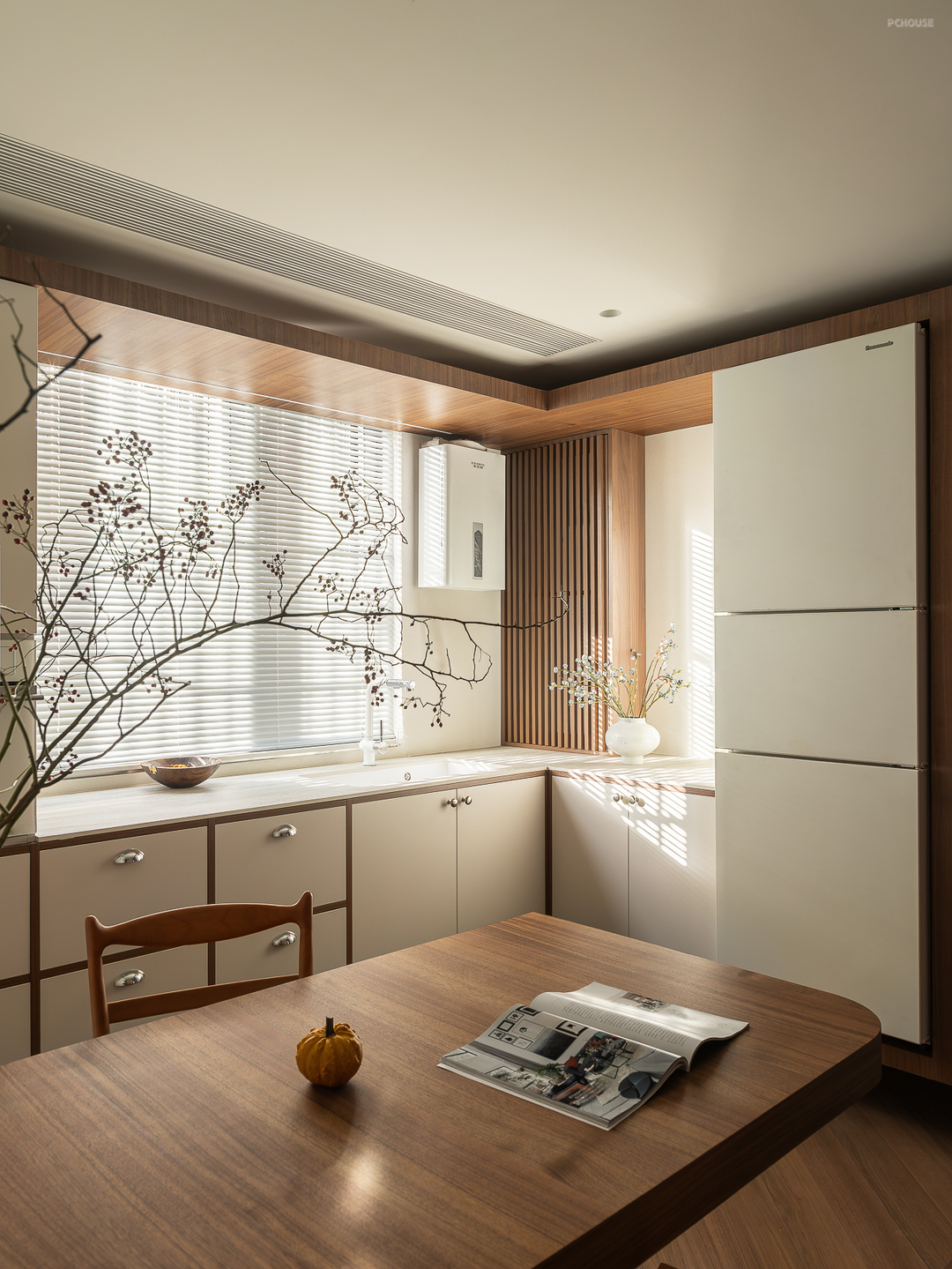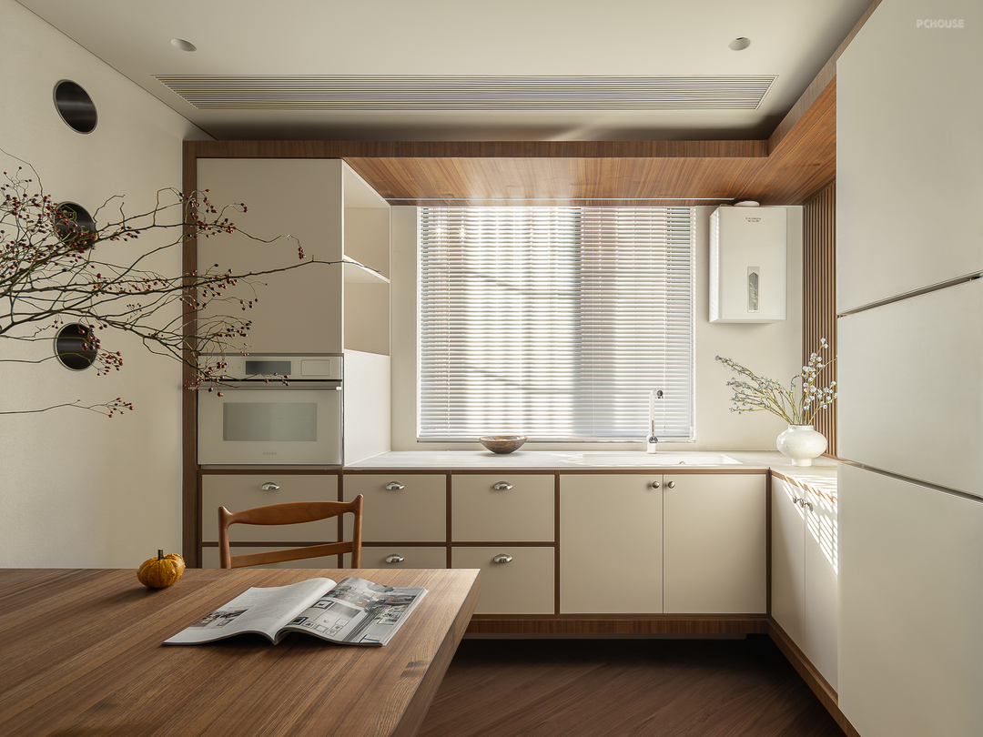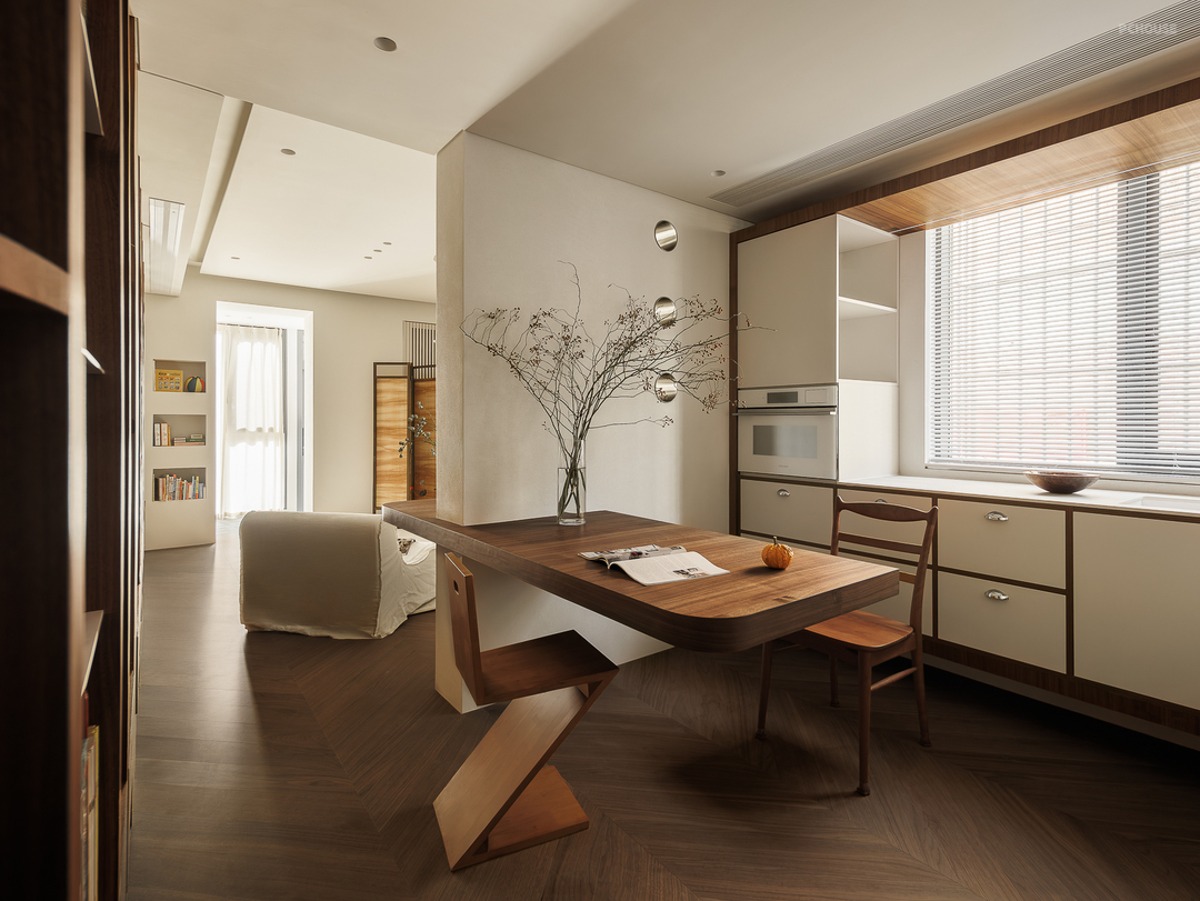 原始的餐厅改造成餐厨一体设计,悬浮餐桌和书桌整合在一起,橱柜也做悬浮处理,不设计灶台,单独作为西厨的功能使用