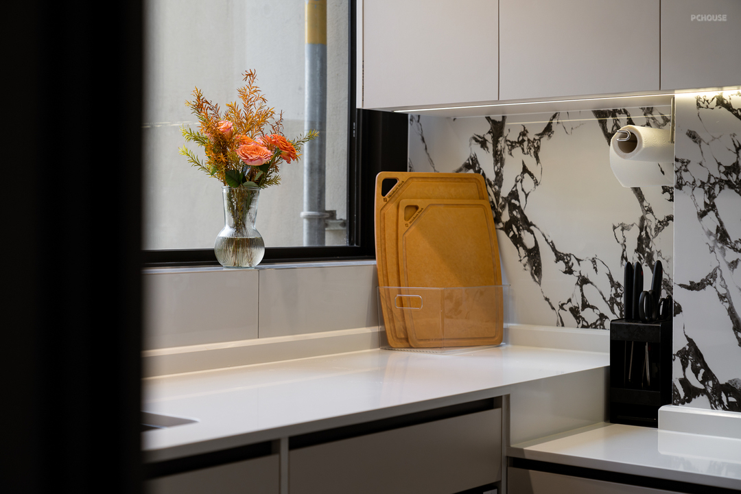 整体空间以白色为主色调,融入宝格丽岩板元素,贴合空间整体风格,质感上更显高级。