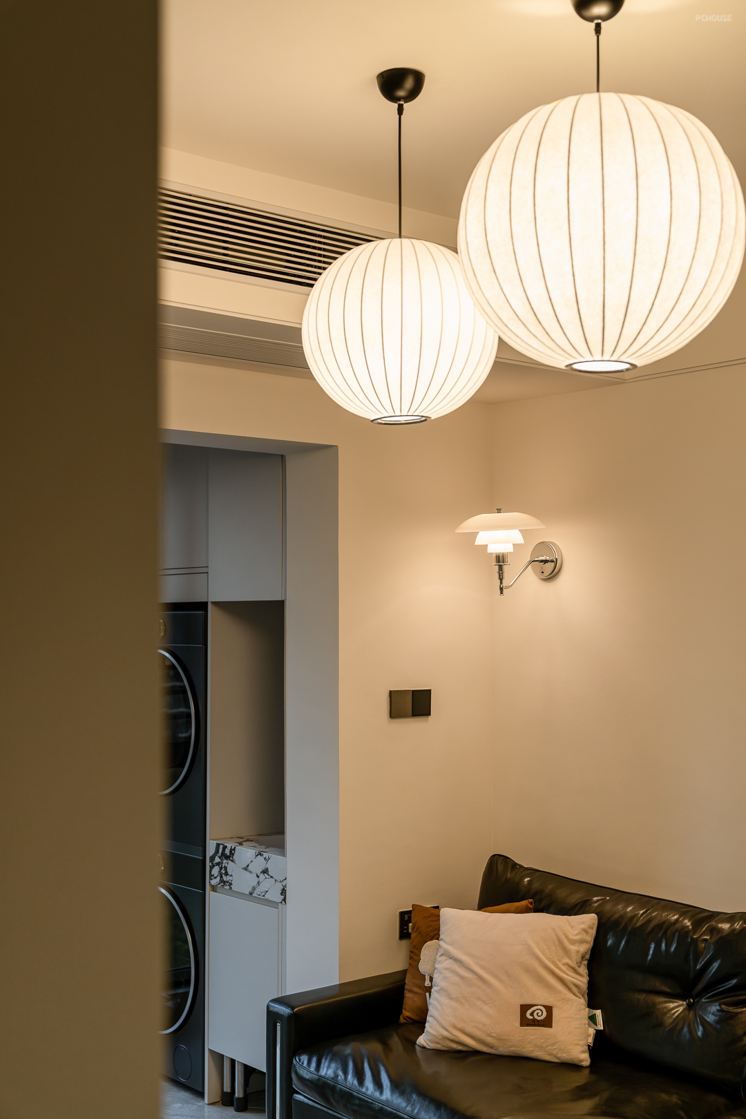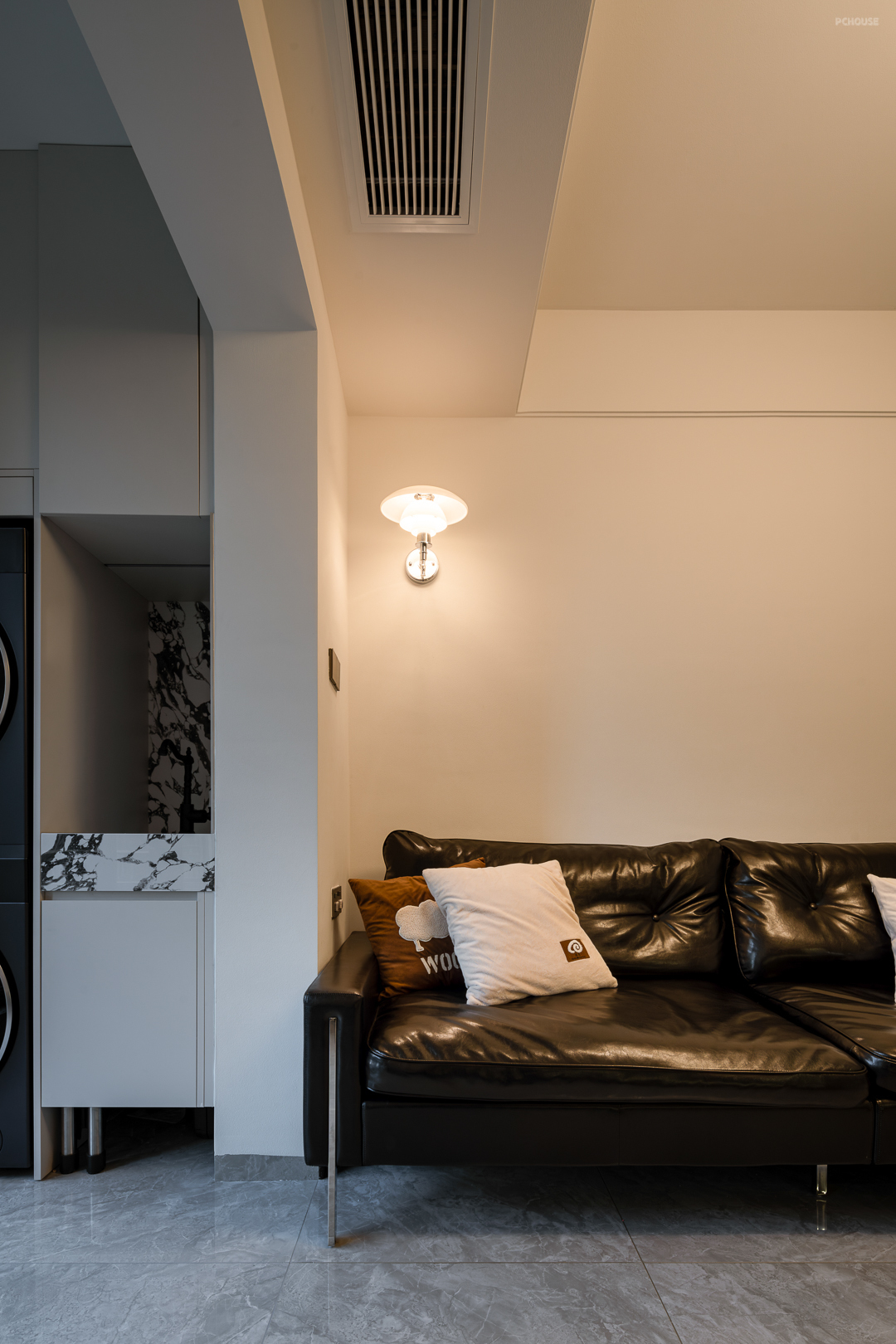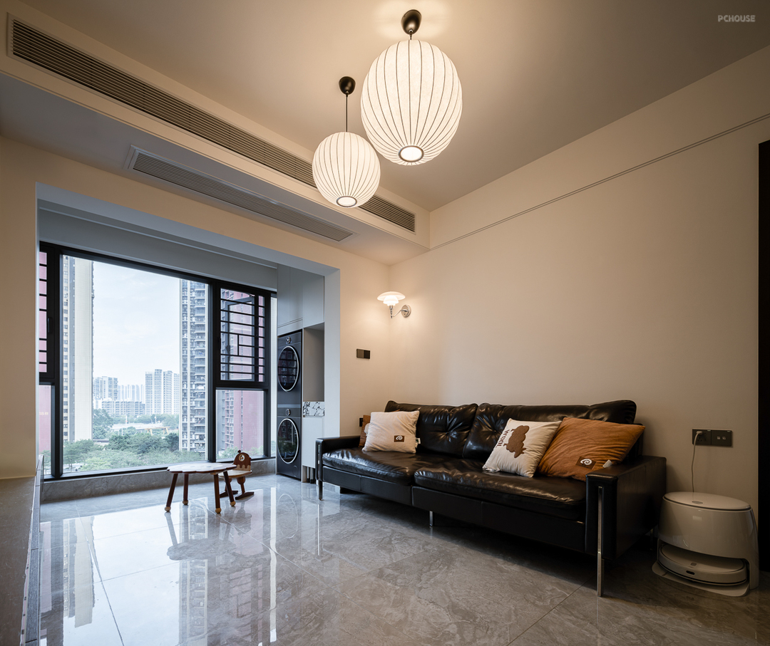 中古的慵懒感在客厅得以具象化体现,黑色沙发作为空间的点缀,给人一种沉稳而内敛的感觉,视觉上增加了空间的层次感。