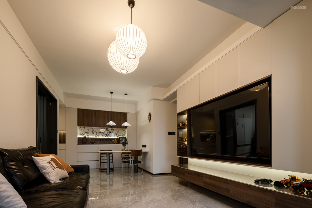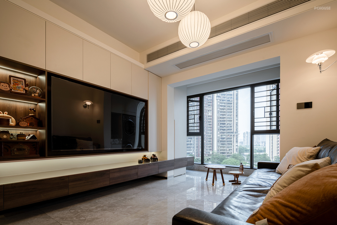 2、客厅电视背景墙做满墙收纳柜+悬浮柜抽屉,可用于日常囤货和常用物品收纳。