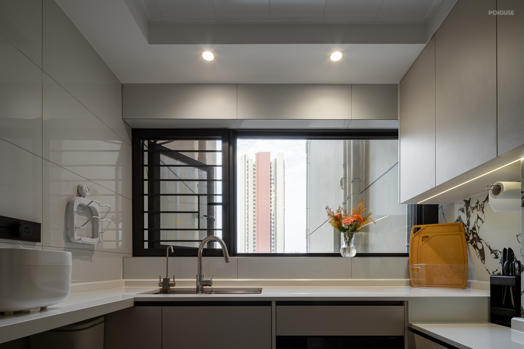 男主人比较高,身高在180以上,秉持“洗碗洗菜不废腰,切菜炒菜不费力”的原则,设计师在设计操作台时,将高度调整成了97cm,提升做饭的体验感。