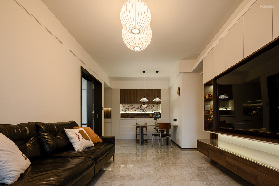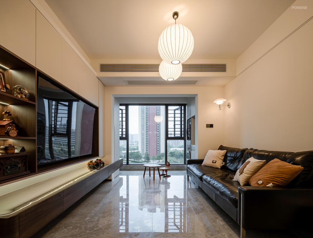 悬空的电视柜抽屉向阳台延伸,与阳台柜相衔接,轻盈又有层次感。