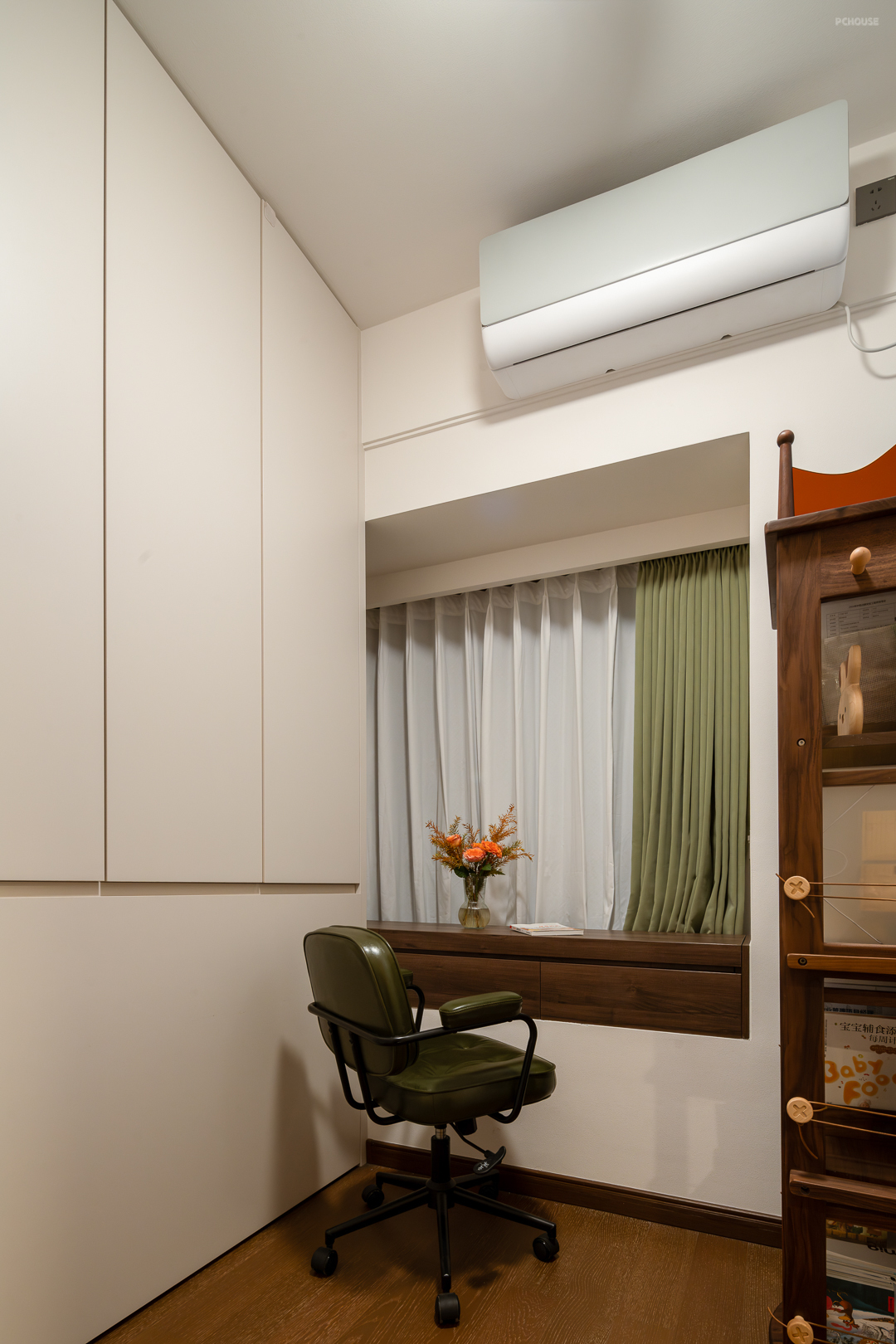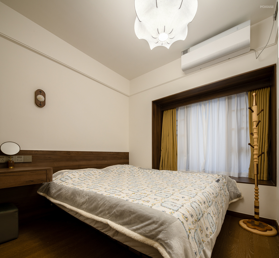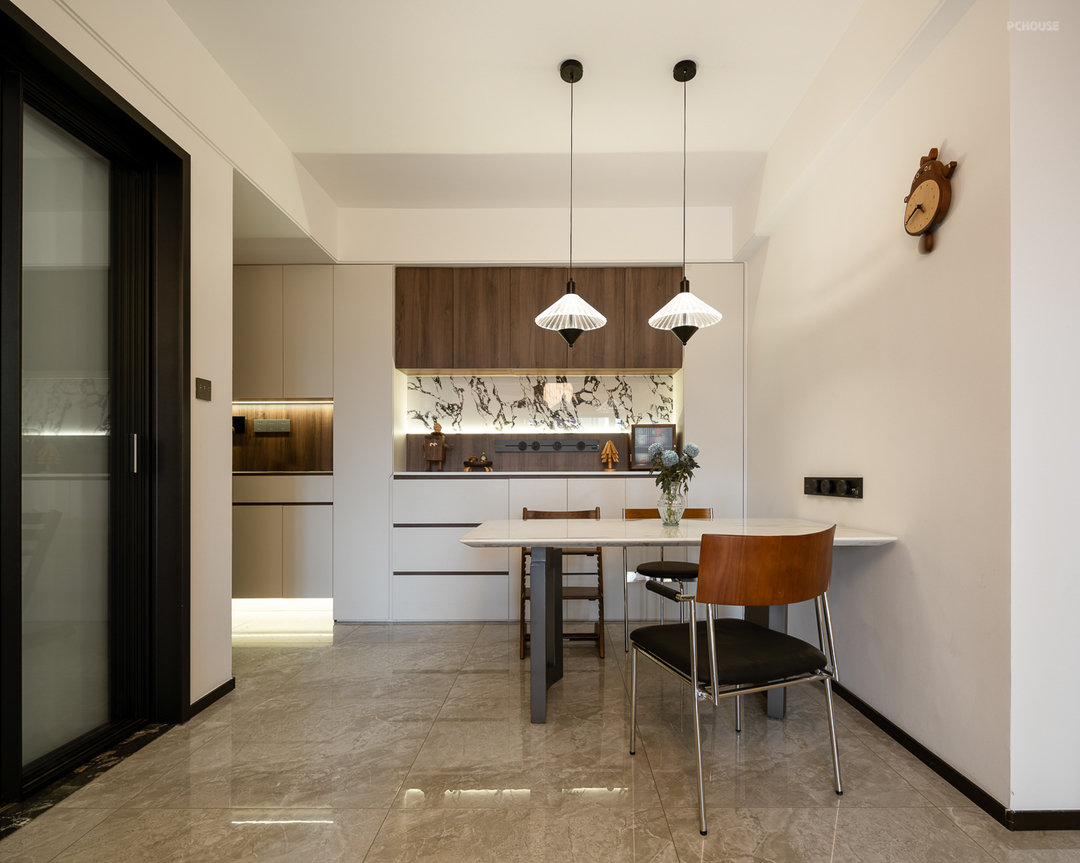除此之外,胡桃木的温润质感包裹了每个空间,深沉的木质色调纹理与白色的墙面相呼应,营造浓郁的奶油复古氛围感。