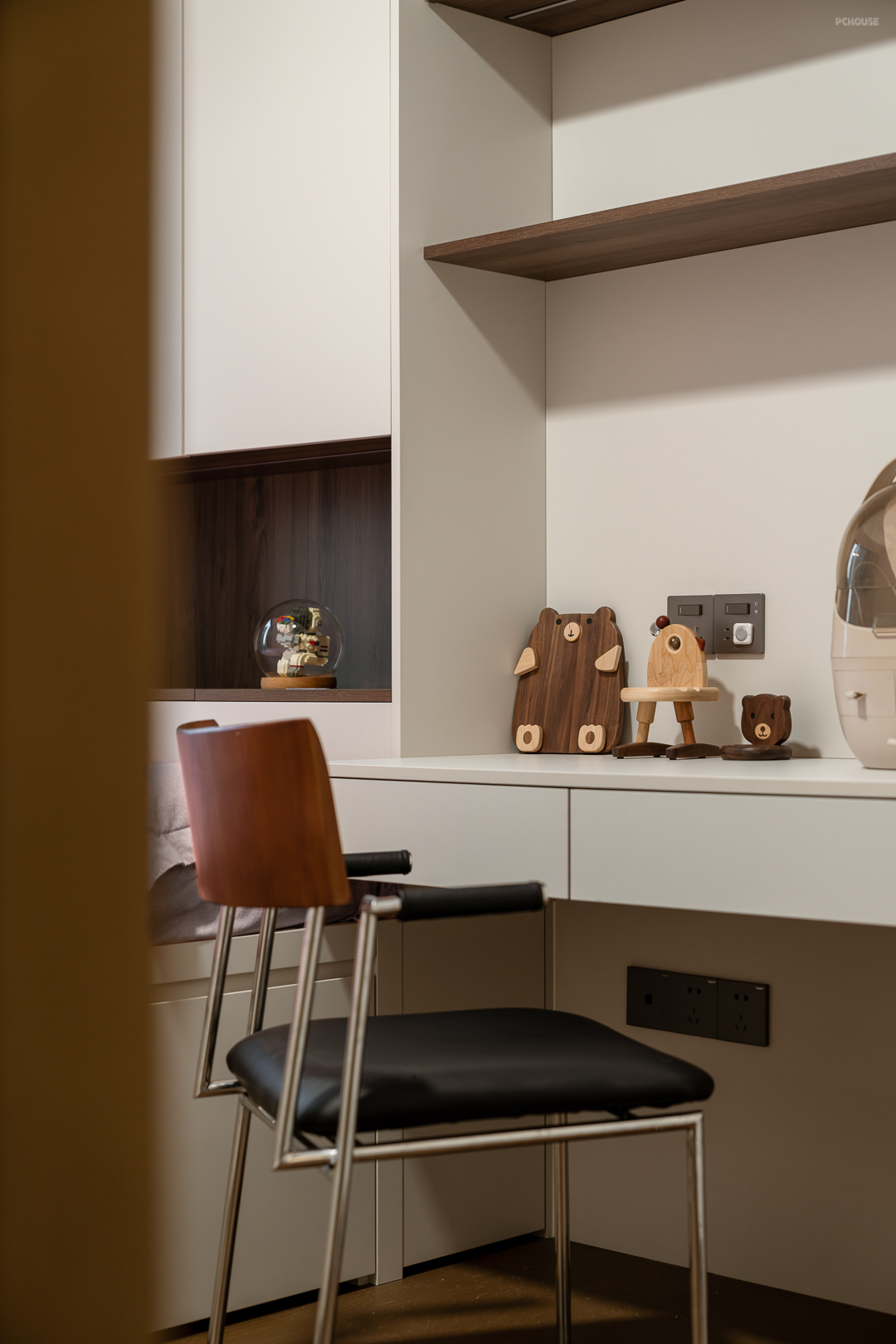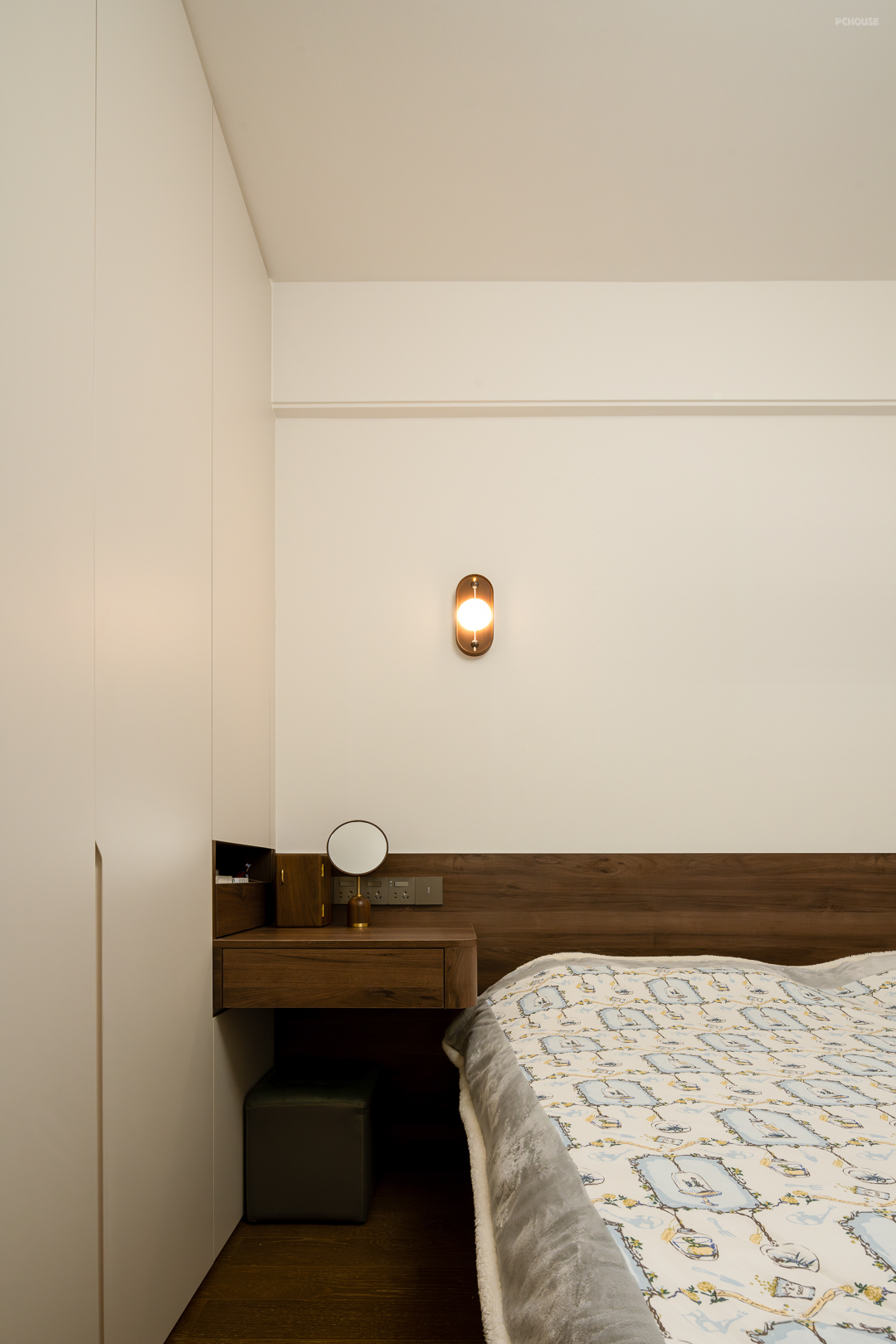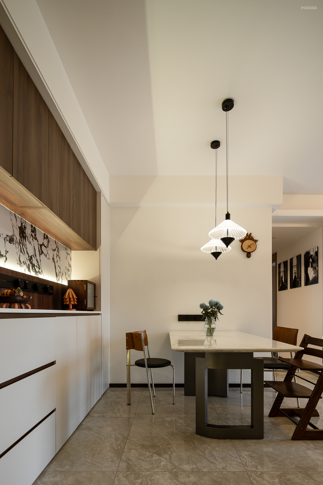 除此之外,胡桃木的温润质感包裹了每个空间,深沉的木质色调纹理与白色的墙面相呼应,营造浓郁的奶油复古氛围感。