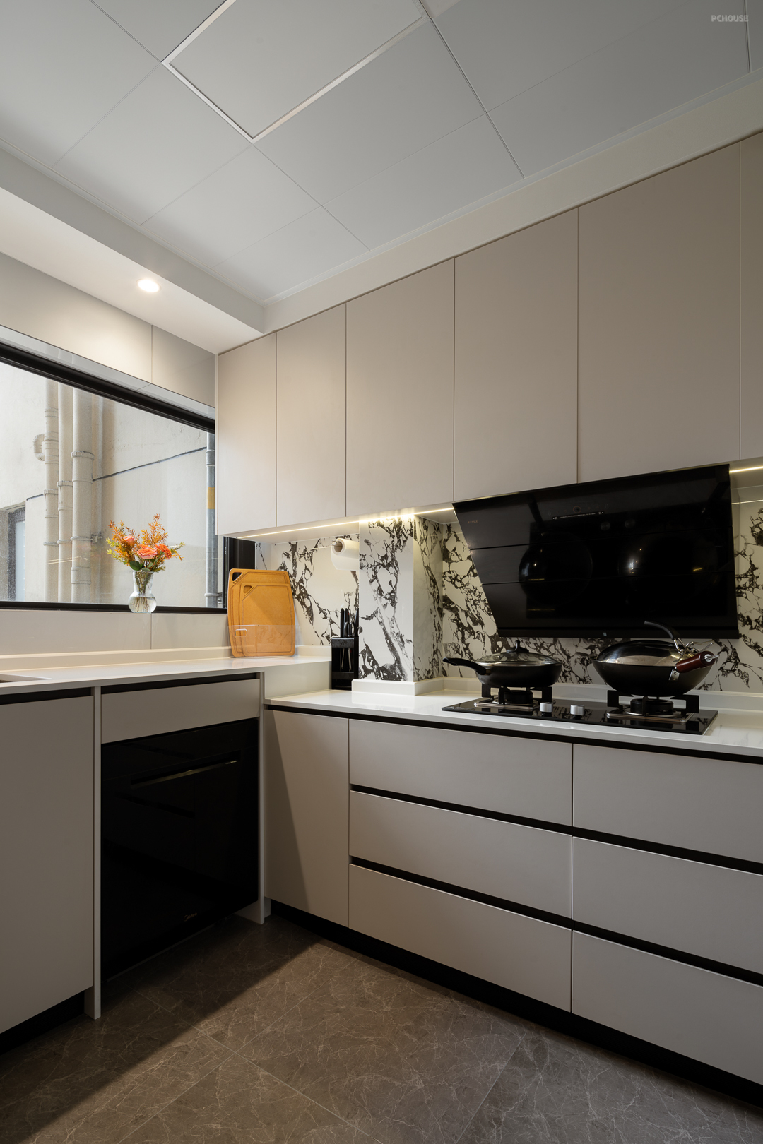 3、厨房的空间更利用到了极致,满是收纳柜和抽屉,业主可根据使用习惯就近收纳物品。