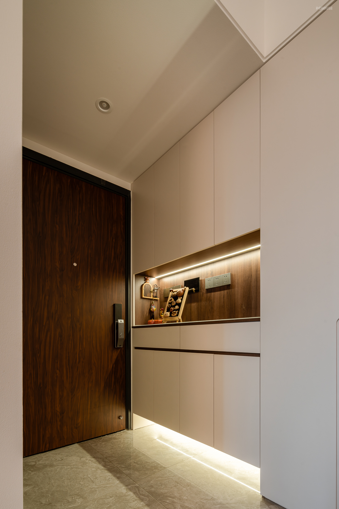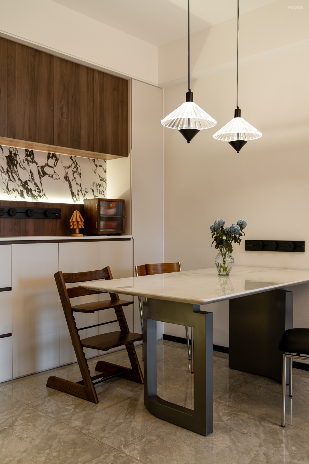 胡桃木搭配宝格丽岩板的餐边柜无疑是家中的c位,也是整个家的视觉中心。内部嵌入暖黄色灯带,中古氛围感拉满。