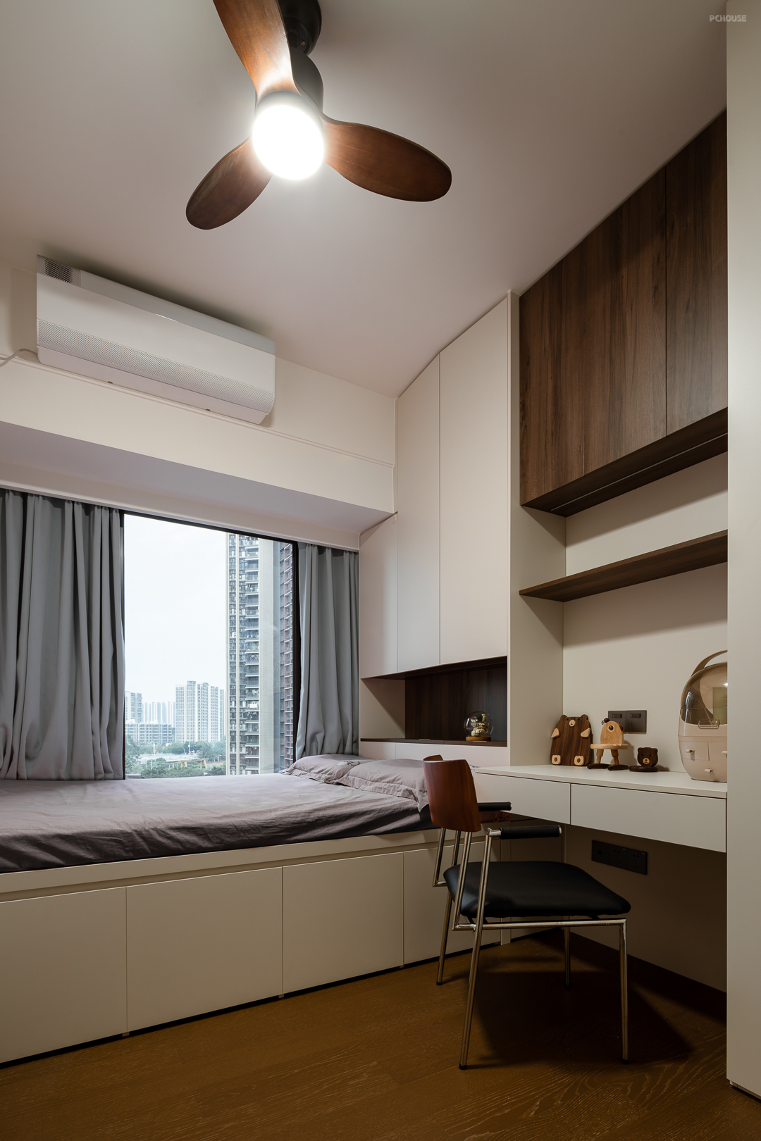 根据业主的需求,设计师将书房设计成多功能房,利用收纳柜下层空间设计下翻床,兼顾了卧室和娱乐空间。