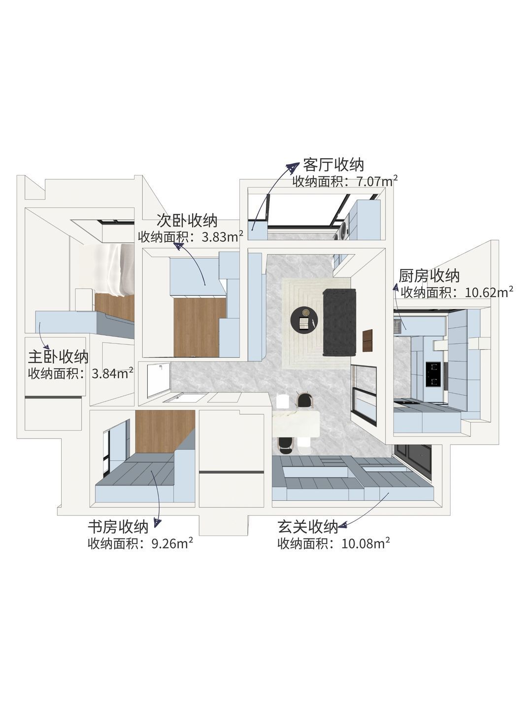 每个区间都根据功能区和屋主的使用习惯,进行了收纳分区,实用性拉满,日常使用更便利。