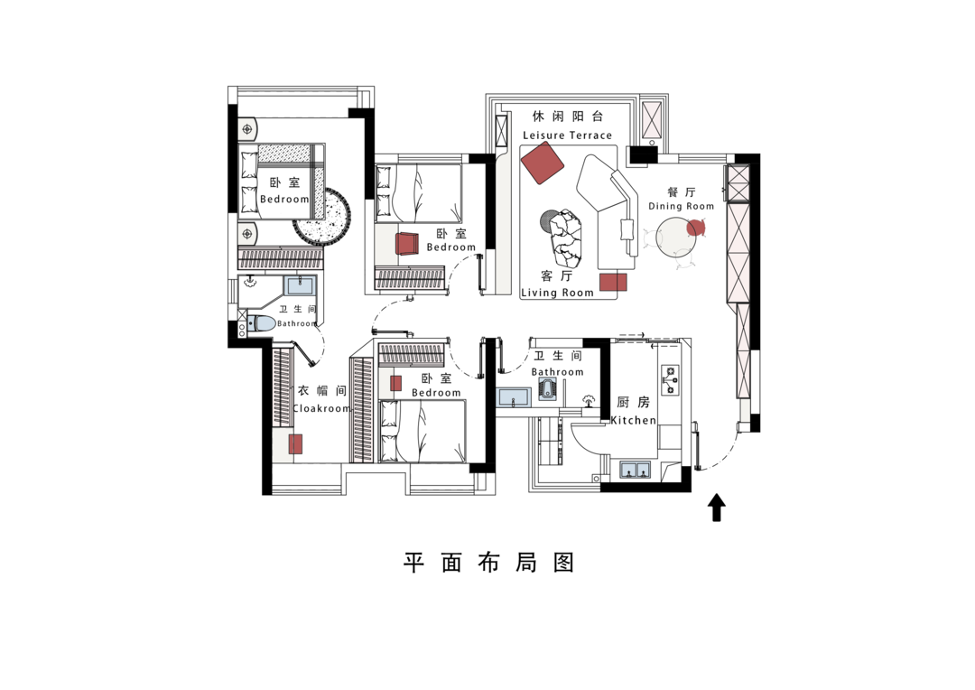 3.将一间面积较合适的次卧改造成衣帽间,并与主卧相连,使主卧升级为带有衣帽间的套房。