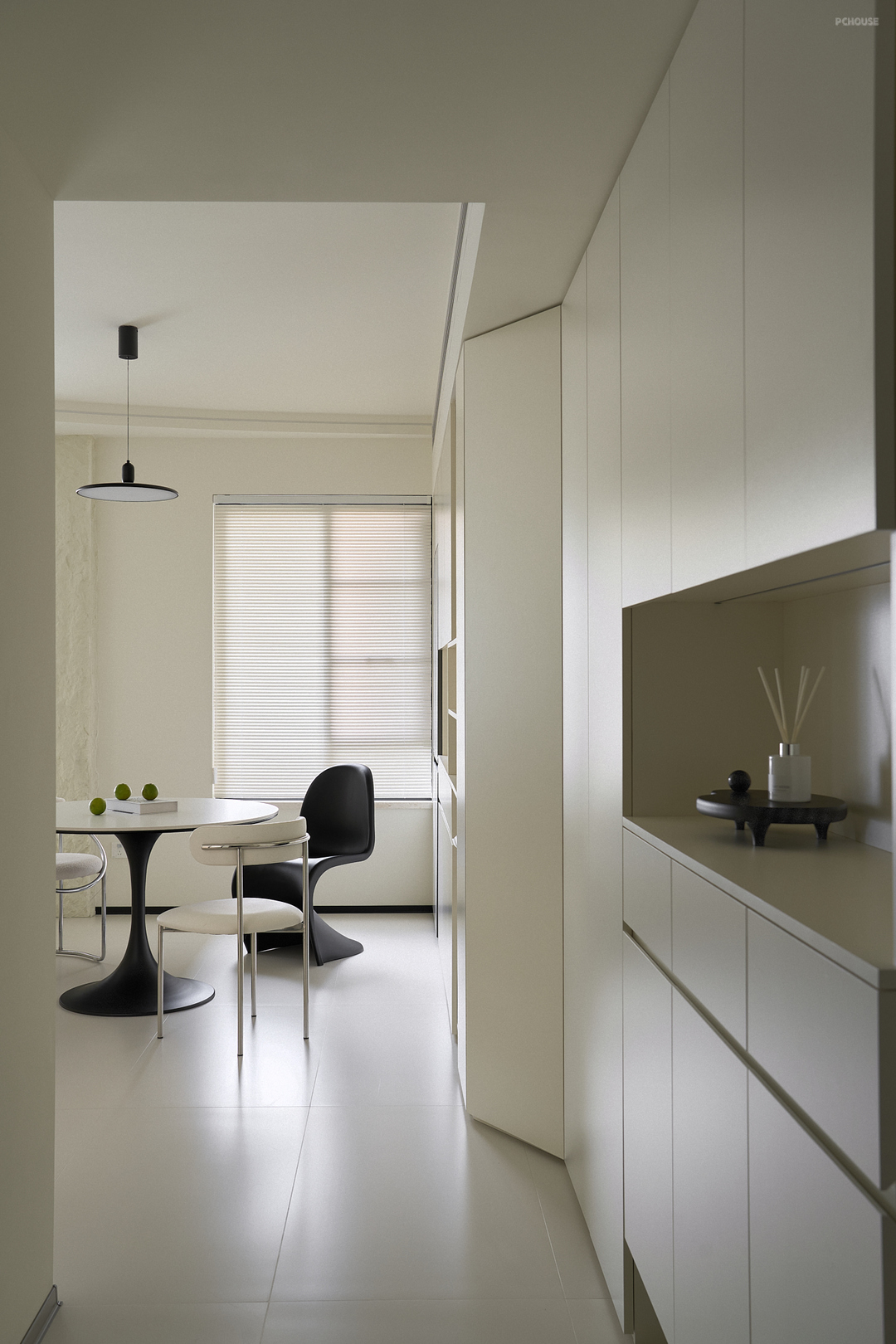 餐厅设有一张圆形餐桌,白色台面简洁明亮,没有过多的修饰,一眼就能感到清新和舒适;正上方悬挂着极简风格的吊灯,黑色的灯罩散发出柔和的光线,在这样的环境下就餐,让人感到格外放松和惬意。