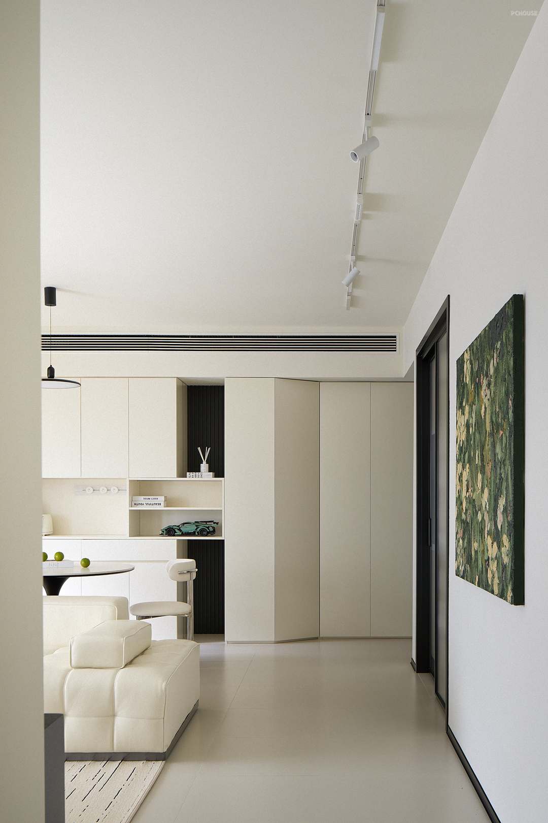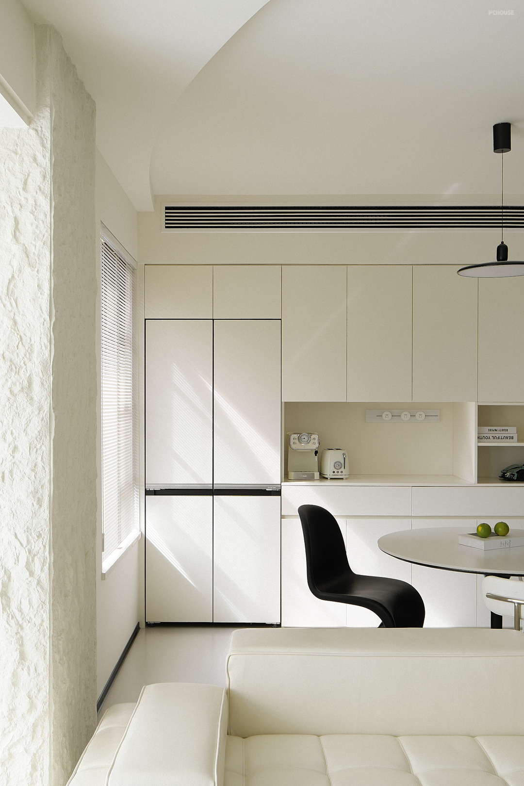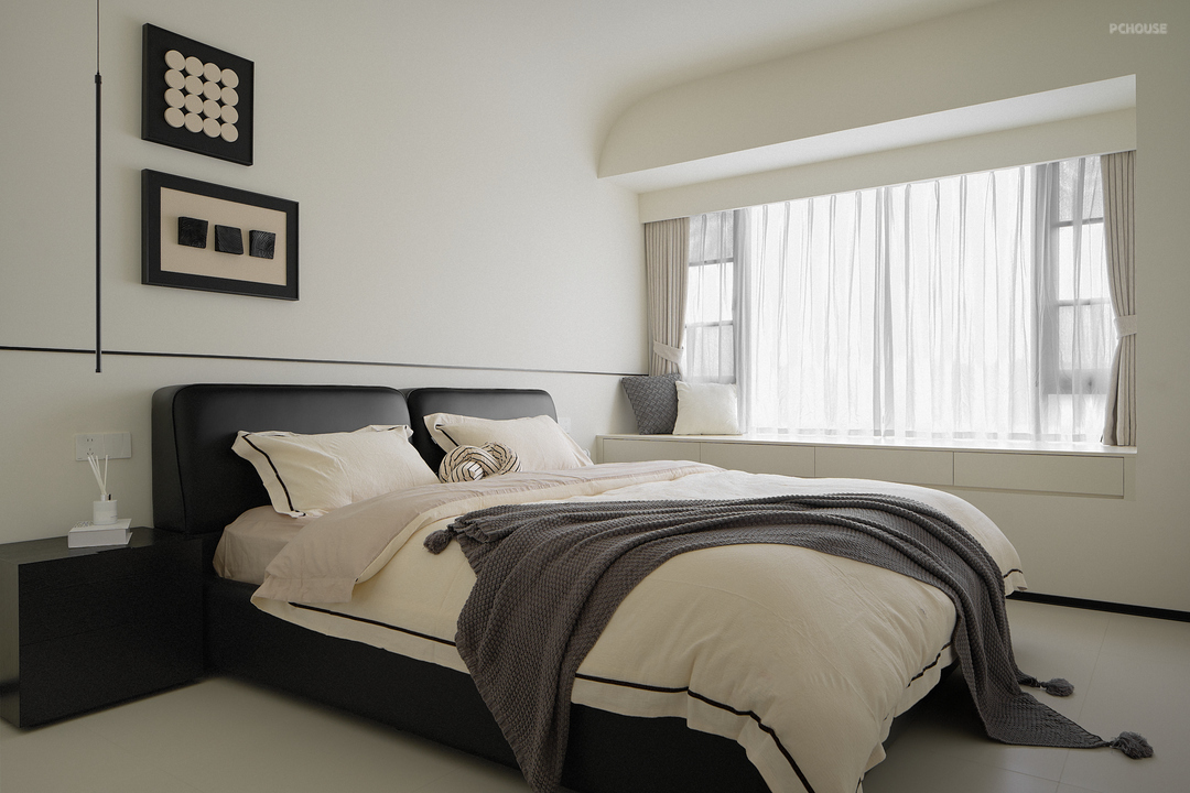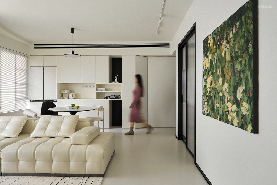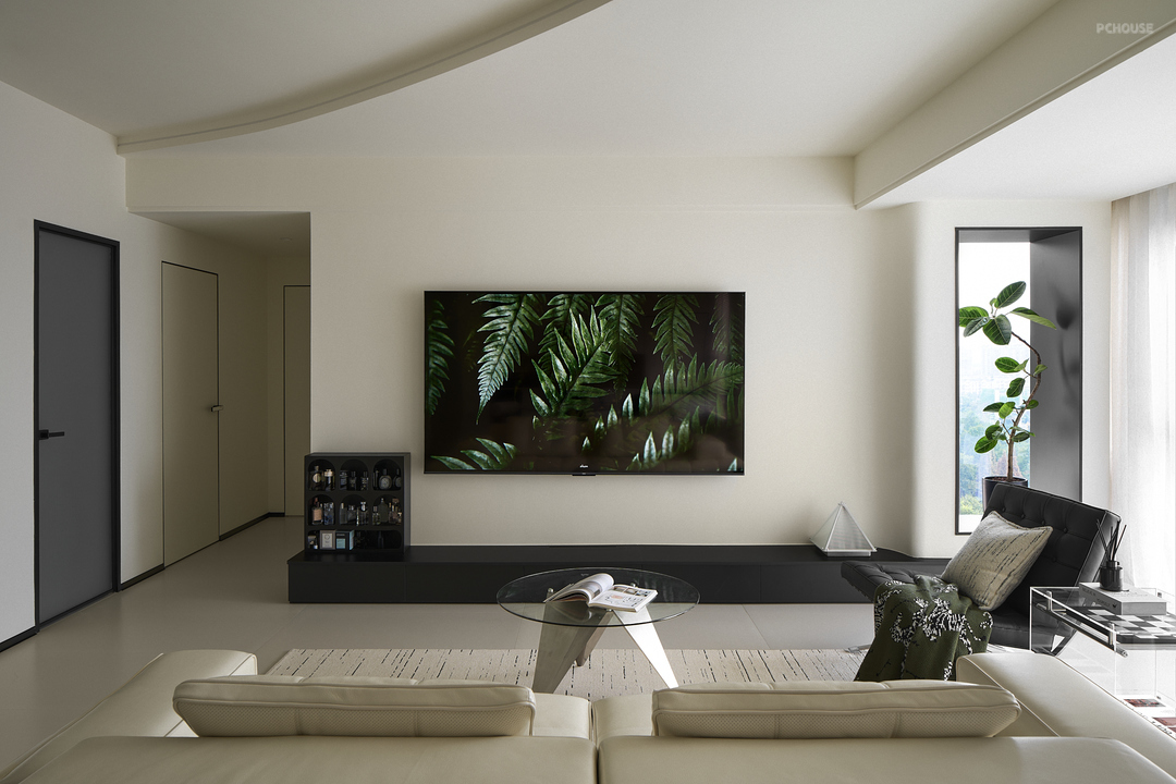 整体空间以柔和的奶白色为基调,辅以黑色点缀,形成鲜明的对比,增强视觉冲击力,为纯净的奶白色空间增添层次感和现代感。