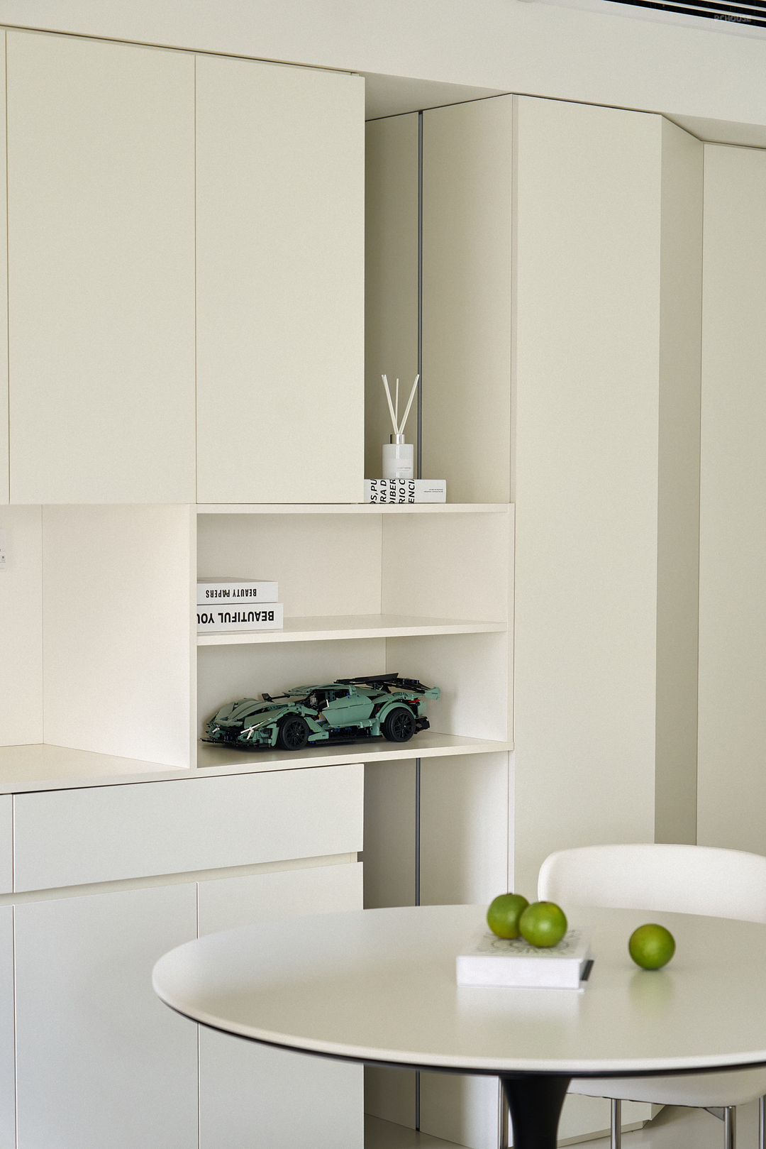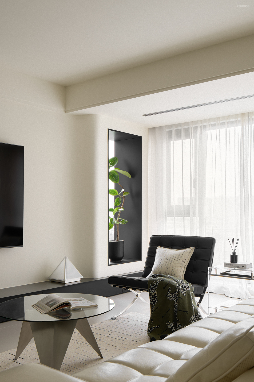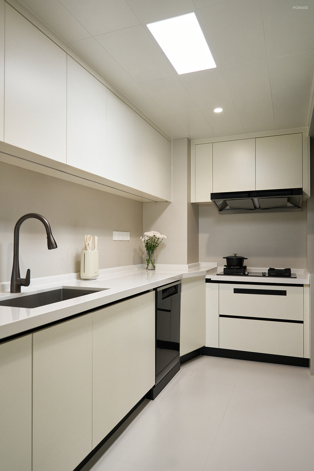整体空间以柔和的奶白色为基调,辅以黑色点缀,形成鲜明的对比,增强视觉冲击力,为纯净的奶白色空间增添层次感和现代感。