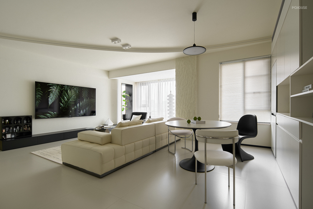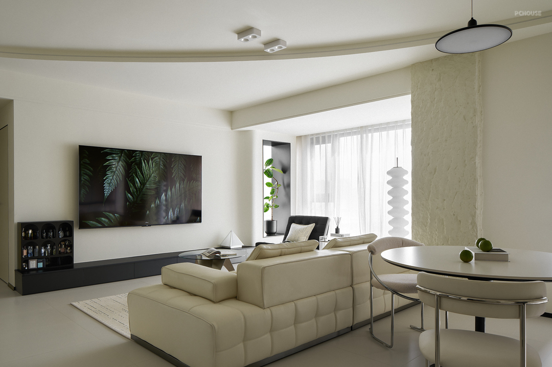 客厅采用无主灯设计,提供了更加灵活的照明选项,增强了空间的层次感和视觉舒适度;吊顶采用大弧形的造型,则有效避免了空间的压迫感,进一步扩展了客厅的视觉空间。