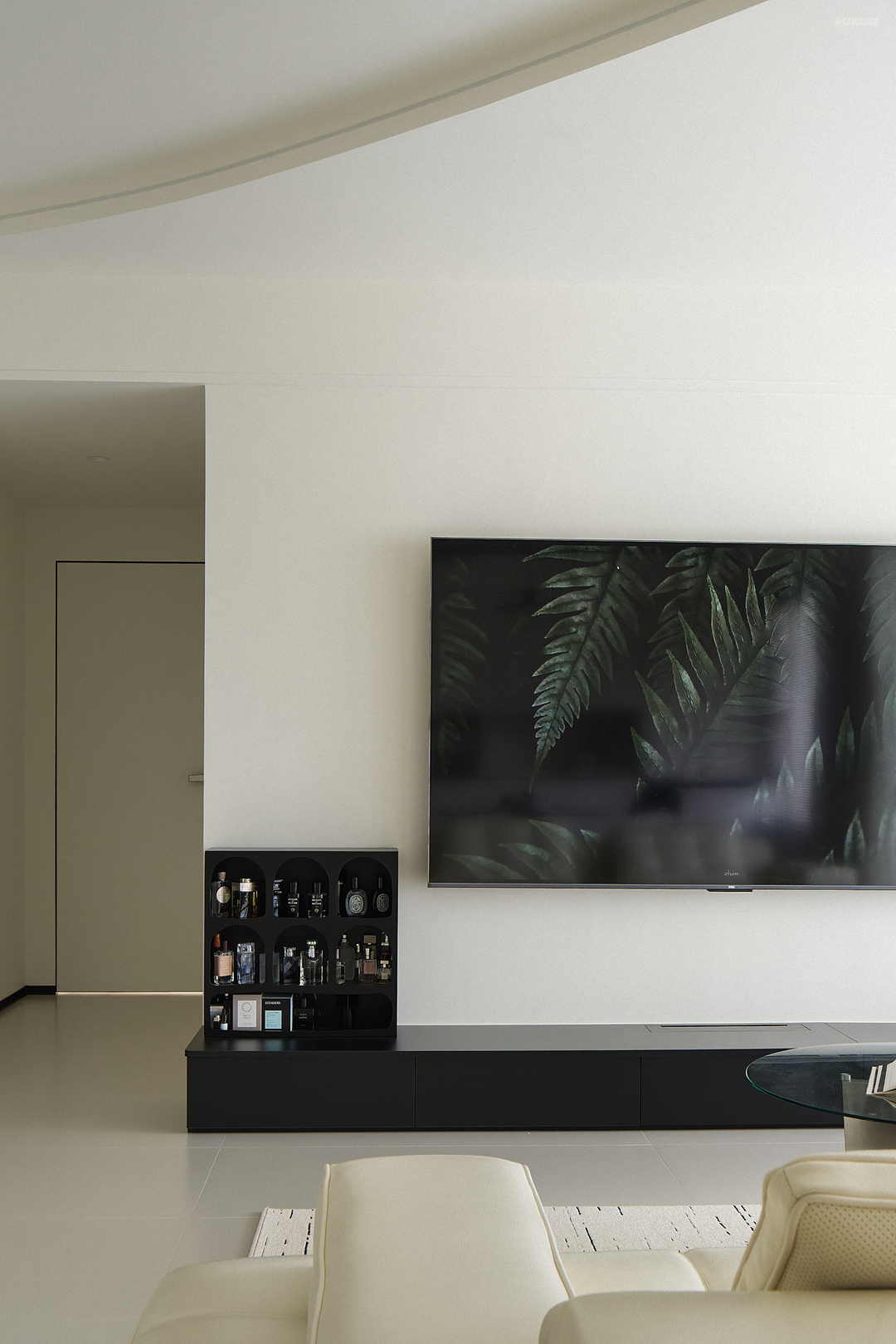 在落地式电视柜的上方,设置了展示架,用来展示女屋主钟爱的香水,为这个简约风格的家居环境增添了一丝温馨的氛围。