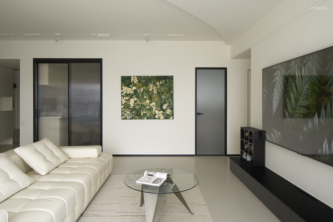 客厅的电视背景墙连接阳台一侧设计成“画框”,引景入室,弱化阳台和客厅之间的一个分割,打造丰富空间层次感。
