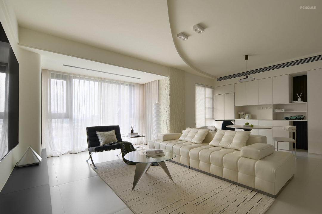 客厅摆放着极简风沙发,透明的现代茶几放置客厅中央,为整个空间注入了现代感与时尚气息;