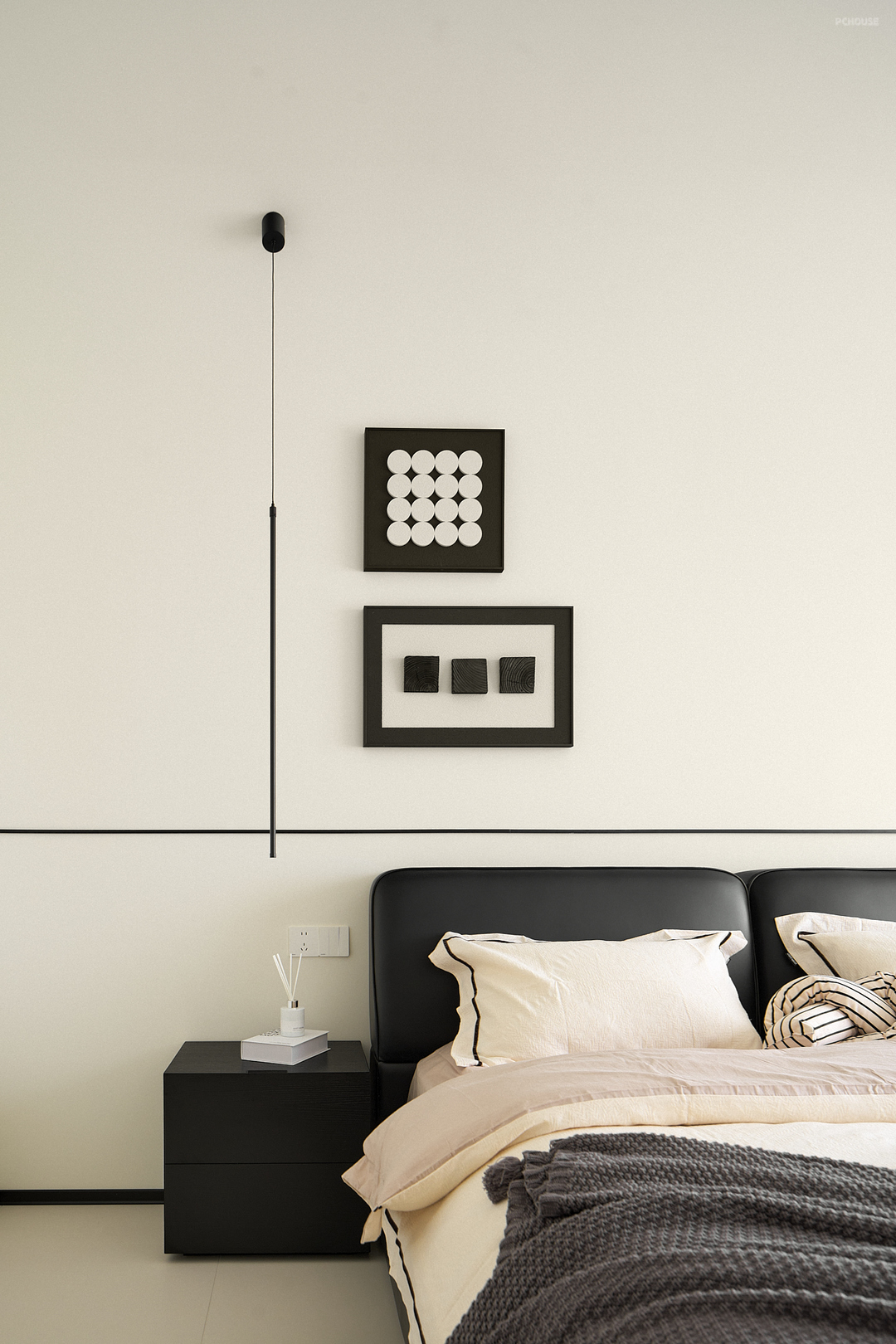 主卧延续整屋色调,简洁干净。极简风双人床居中摆放,床头背景墙摒弃了传统的装饰,采用了一条黑色金属线条来点缀,这样的设计,既划分了空间,又保持了简洁和环保的理念;
