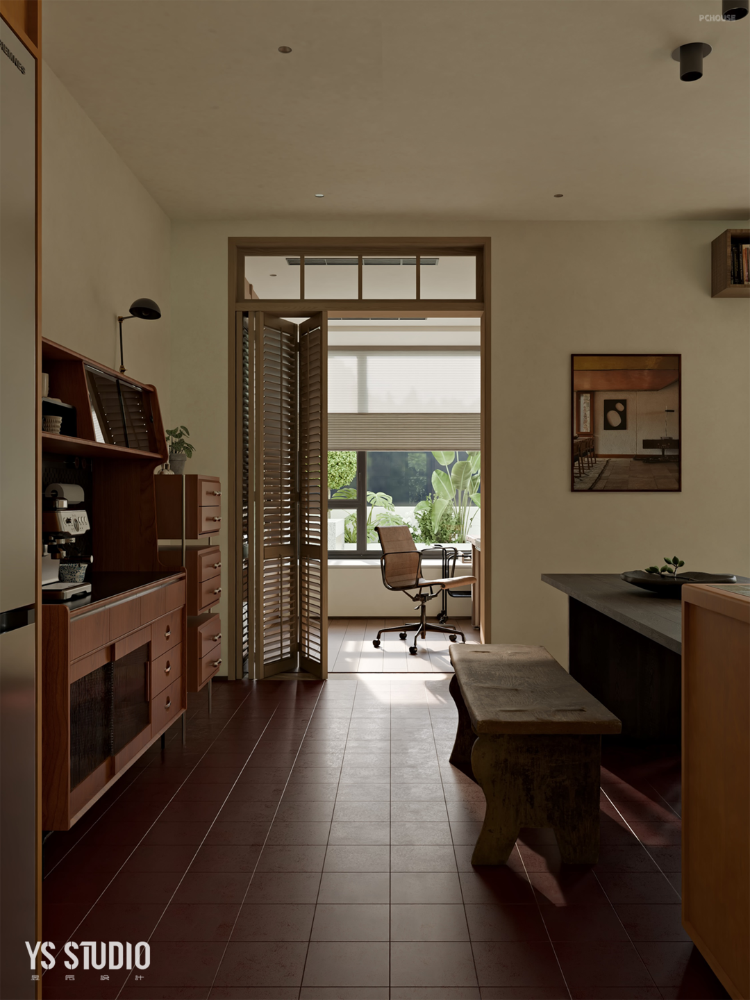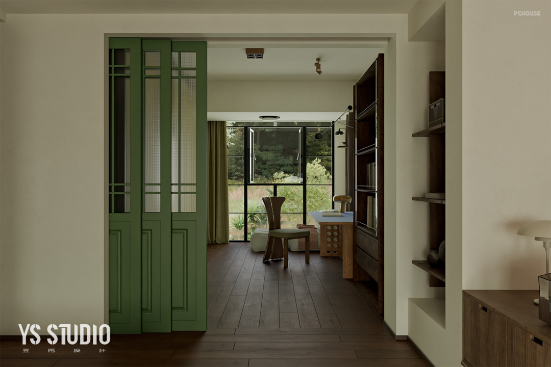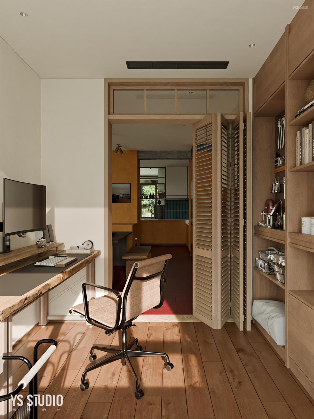 动线再往外延伸,我们将这个较为方正的区域作为男主人的电竞房。木质折叠门形成区域的分割,但光影隔而不断,交汇成美妙的日常。