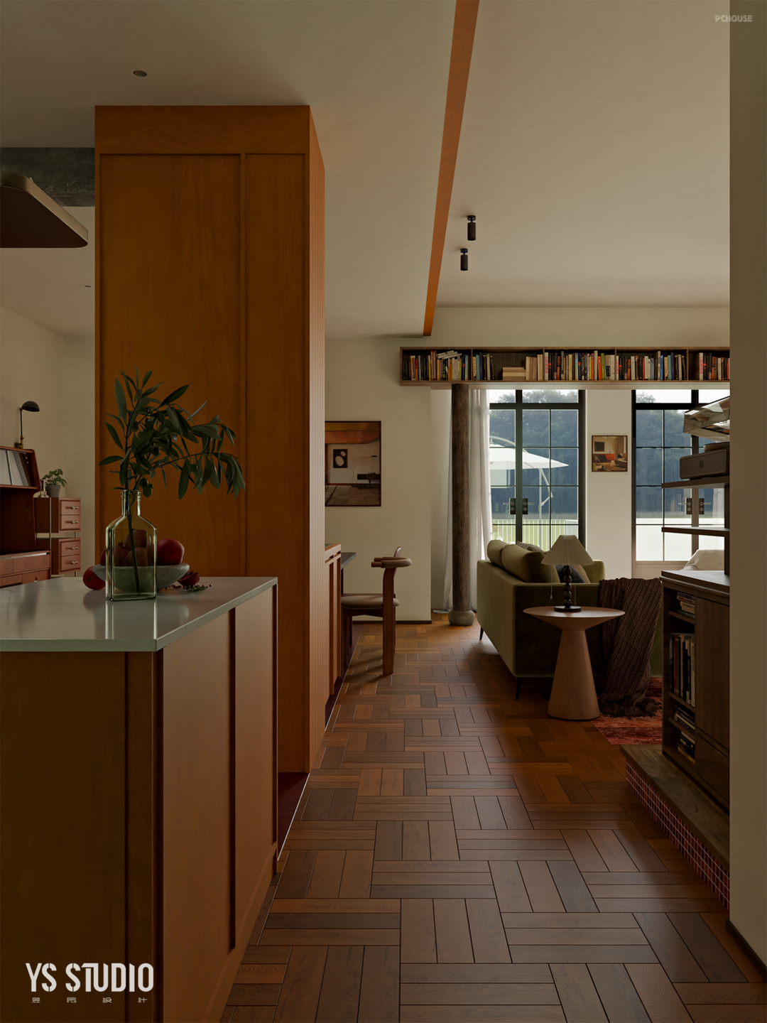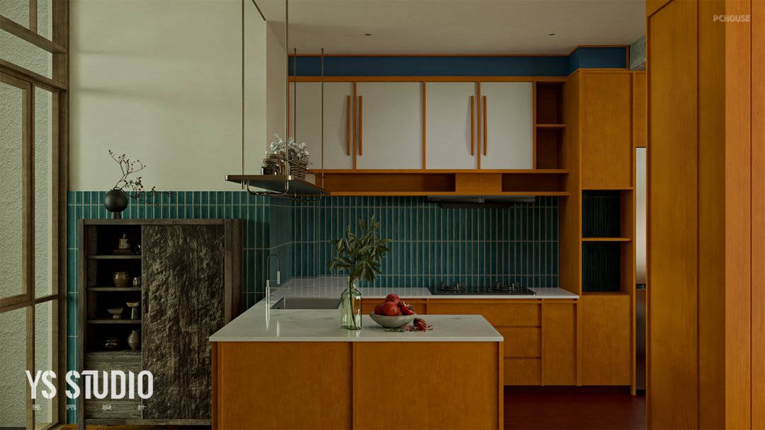 除了大量较为原始带有天然感的材质,我们做了一些丰富的点缀,比如我们没有用传统的大理石去做岛台的表面,而是贴上了绿色马赛克,它与杏黄色的木质立面以及挂画,有着很好的对比关系。无论是大的主体框架、复古的式样或是丰满的细节,都有很好的融合及平衡。