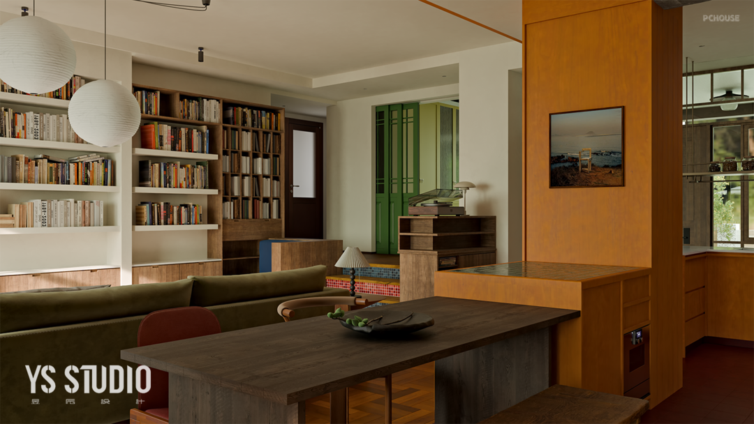 餐厨和客厅的边界是很模糊的,我们用色彩做了很自然的过渡。弱化了相对艳丽的色彩,用白色的基底去承托这个偏自然、复古、生活化的空间。