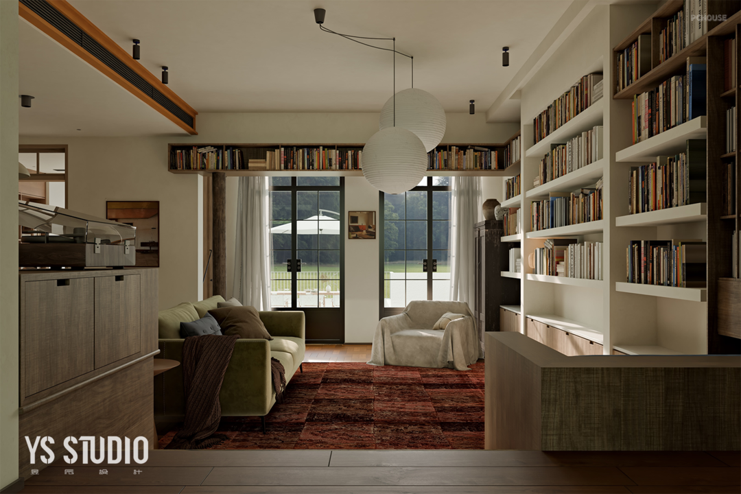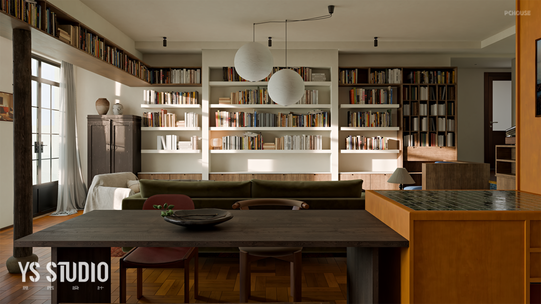 我们将客厅外扩,由两扇对开的复古门窗替代了滑门。余下的70cm大梁,结合书架的形式去贯穿,最后选用一个老原木桩做了空间的穿插对比关系,同时避免了书籍堆放拥挤带来的闭塞感,满足了功能与形式的平衡。从细节上,我们还原空间的质朴感,有很多木质材料的碰撞,但这种碰撞和对比依然以功能为先。