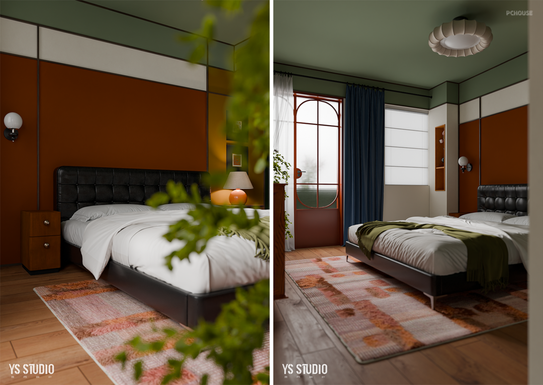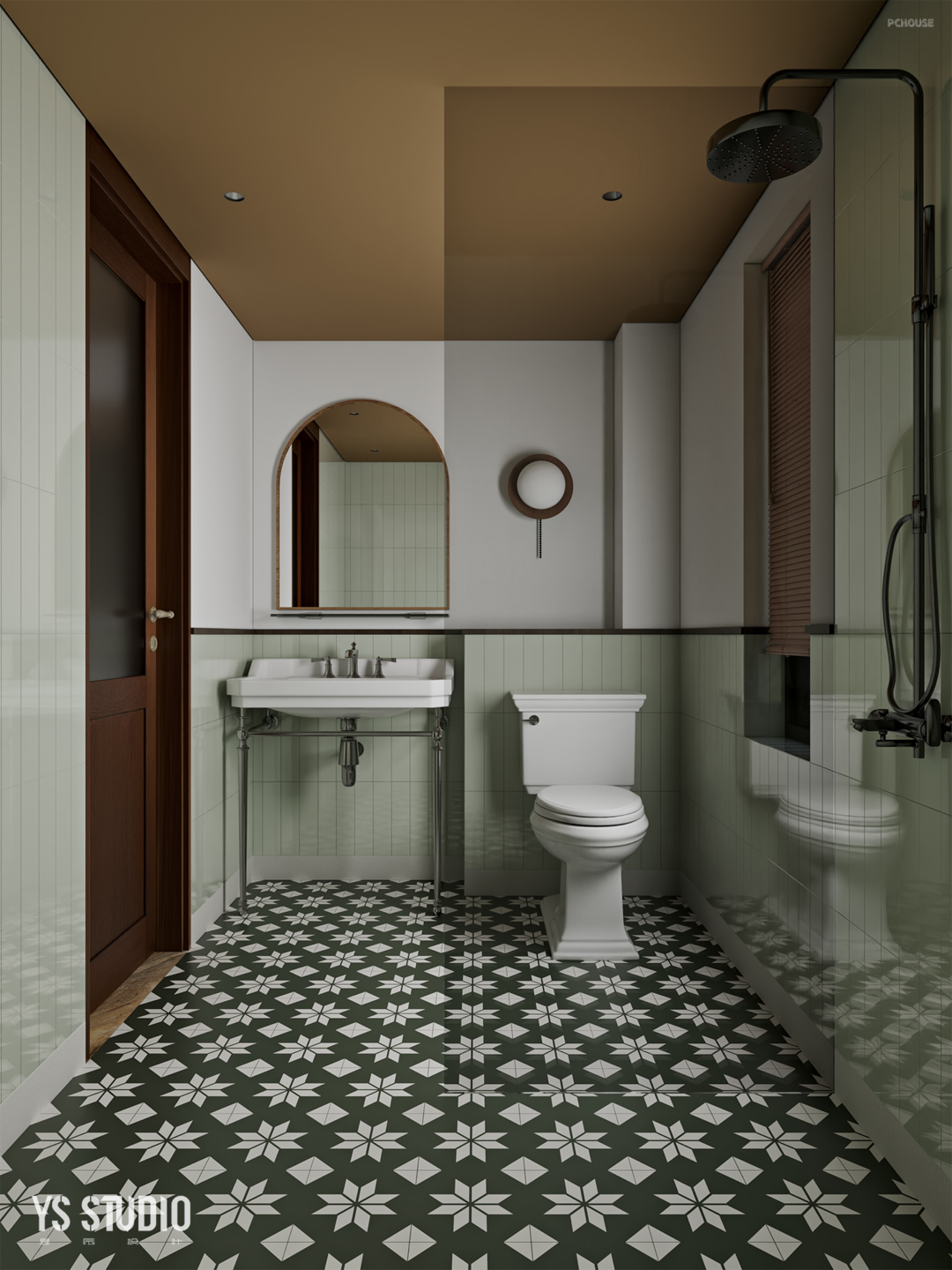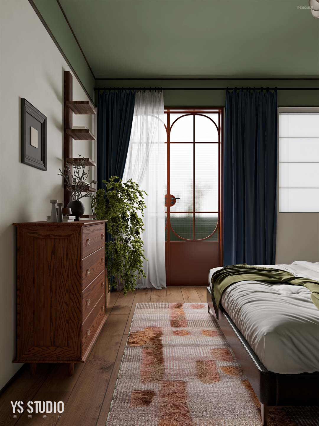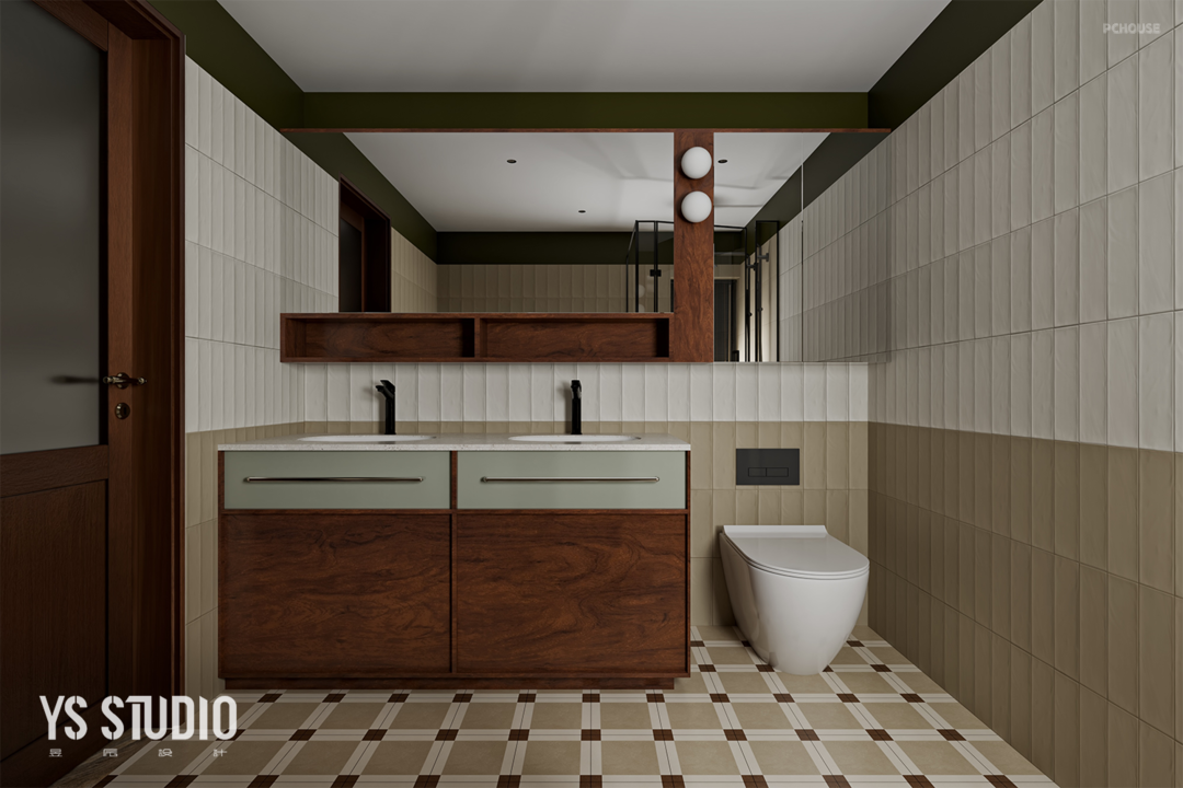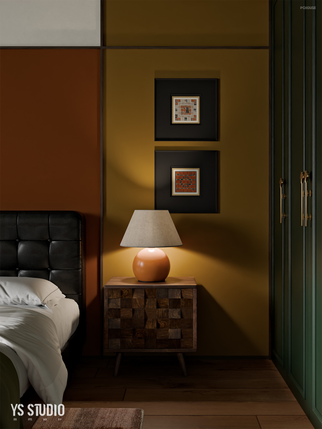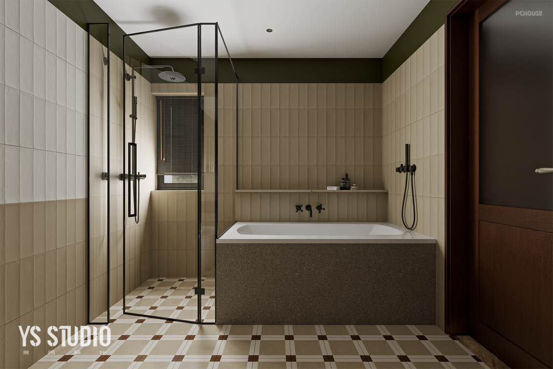 主卧&主卫的色彩充满了风情,变得浓墨重彩,偏厚重的色调和线条的分割增加了复古的场景感,也让空间随之变得沉稳,深一度,的确让人更好入眠。