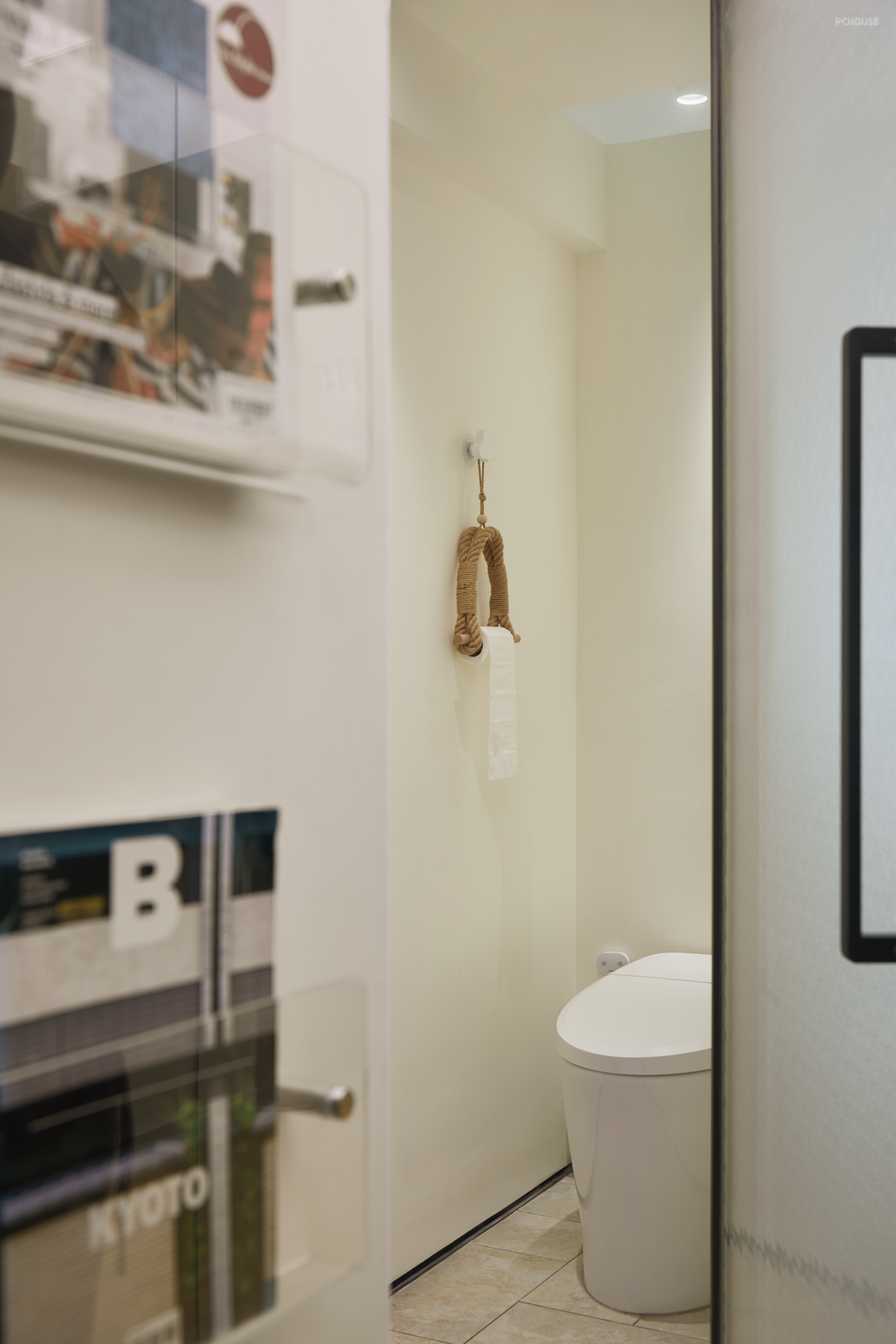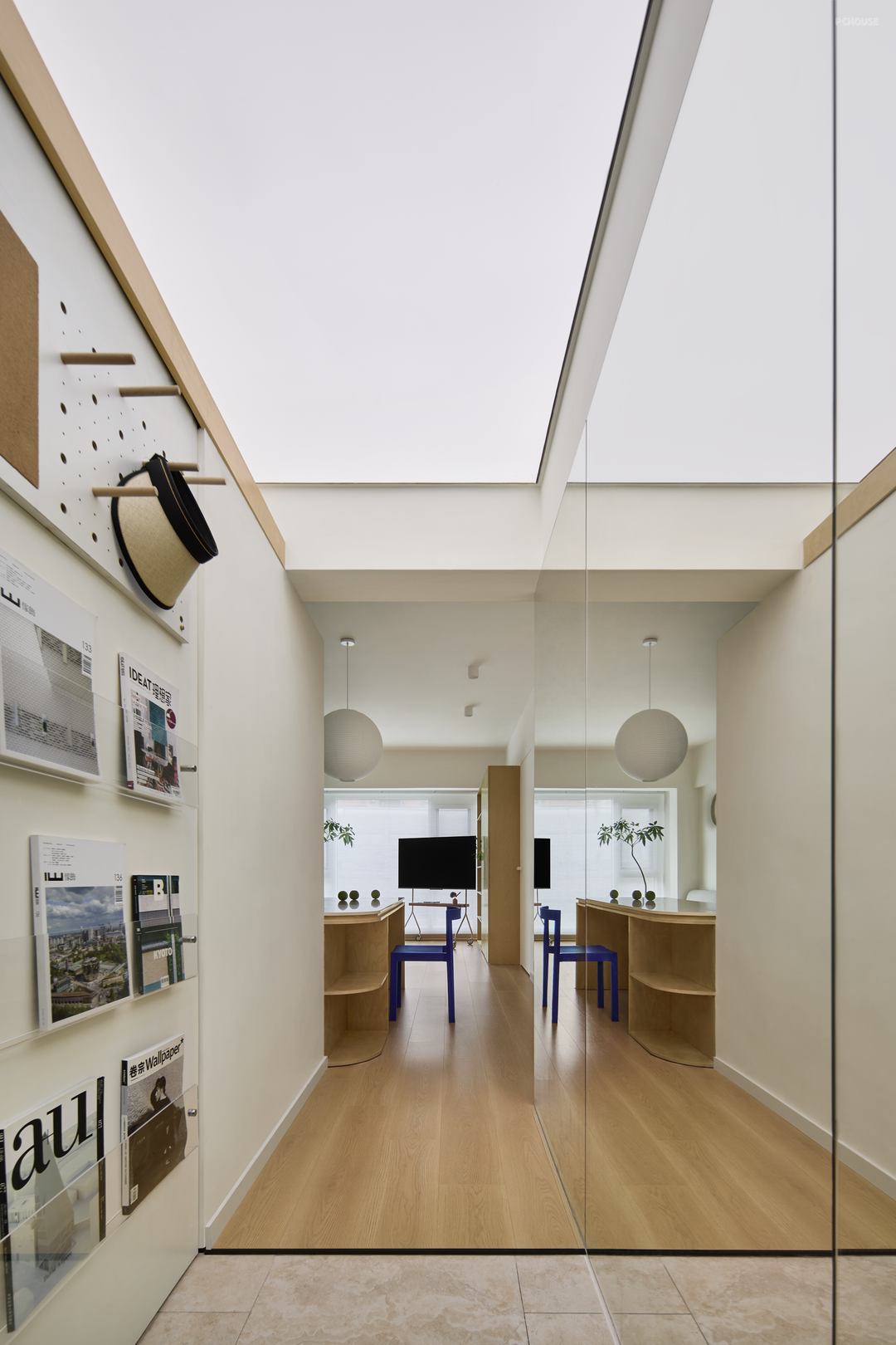玄关左手边的推拉门,既是衣帽架,又是杂志架。