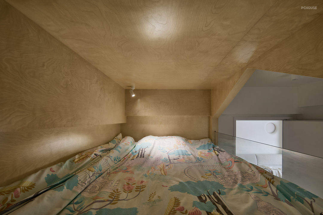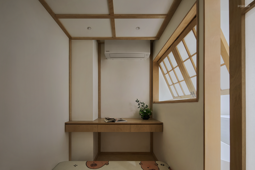 书房里的地板抬高处理,加上垫子就是一间次卧,可作临时客房。在支摘窗边延伸出一张小书桌,室内墙面和天花板用海洋板小木条包裹,弱化墙面与天花突出的阳角视觉。