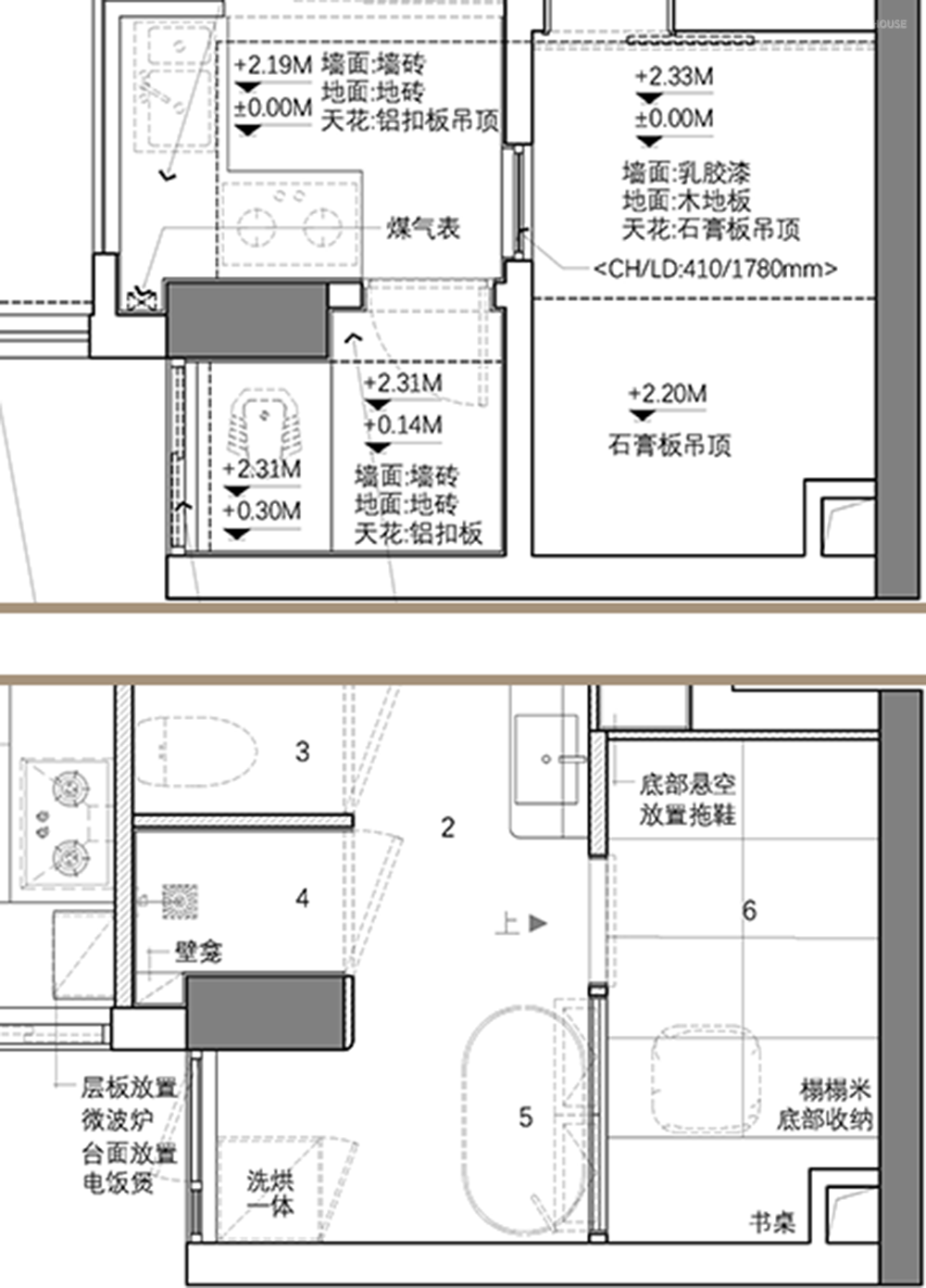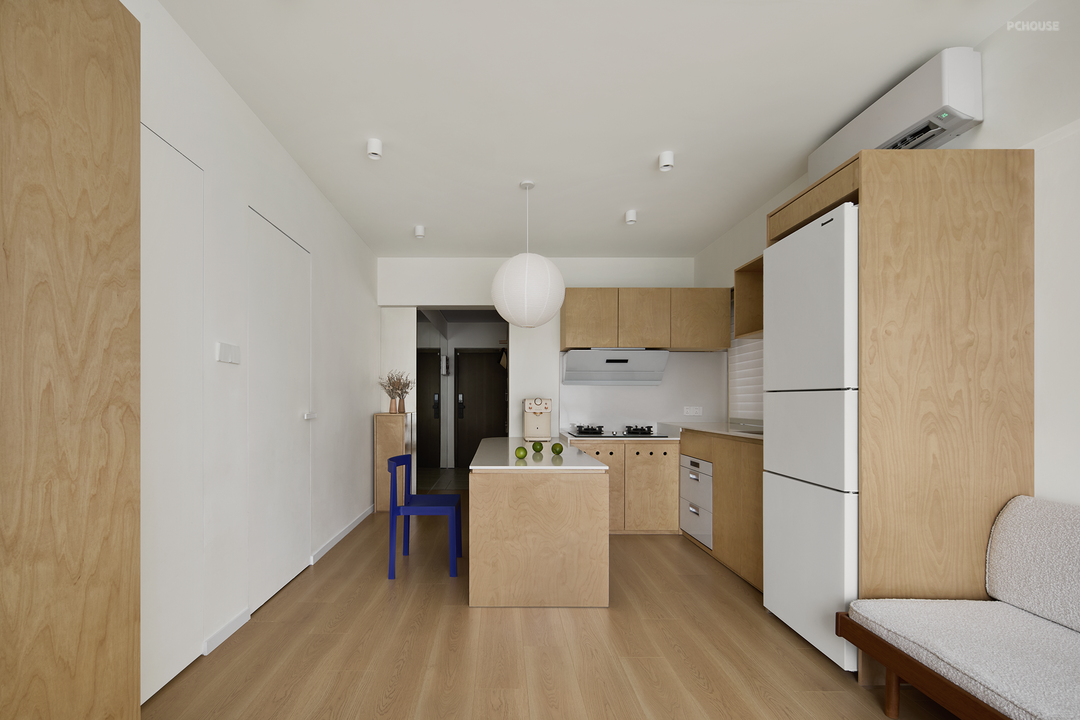 厨房的吊柜持平卫生间盒子顶部高度,视线延伸至梁位,显空间宽敞,也是“卫生间盒子墙面没做到顶”的用意。