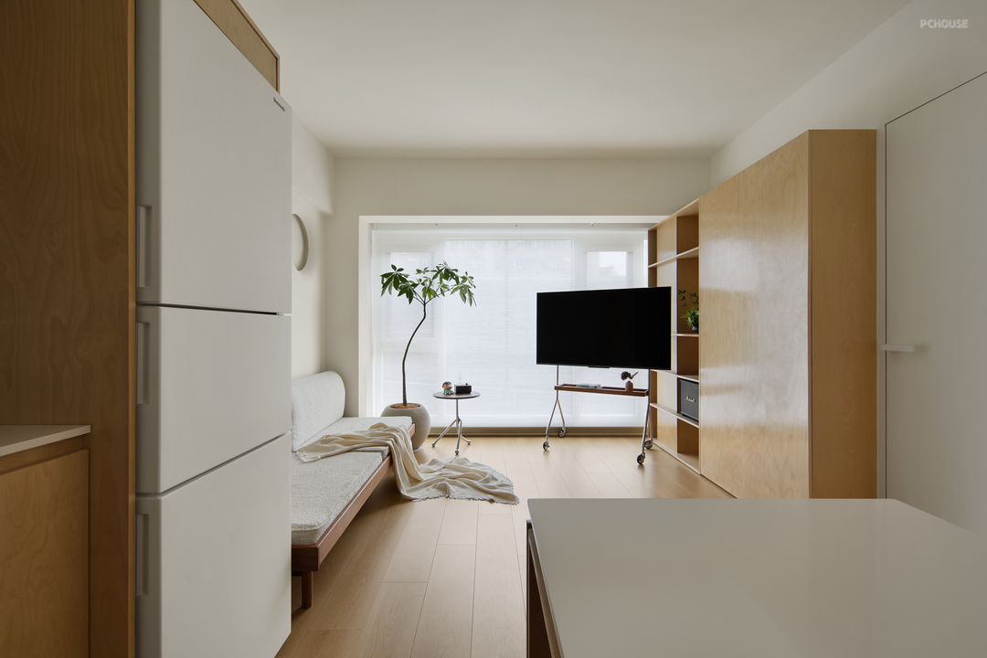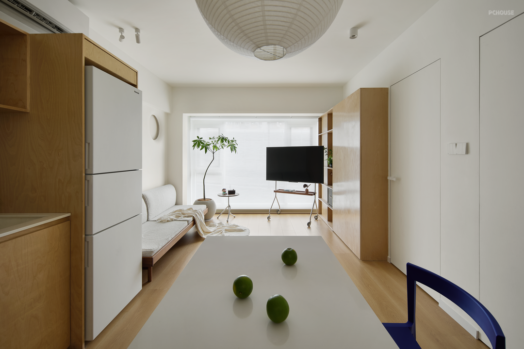 窗外是高架桥,窗外的人看它是老破小。繁华噪杂、车来人往,大多数人对这个家有着刻板印象。窗内住着温馨的三口之家,在54平房子里腾挪一处“滋养胜地”,步入、驻留、观赏、休憩的方寸间,获得“闹市与归处、快节奏与慢步调”平衡。