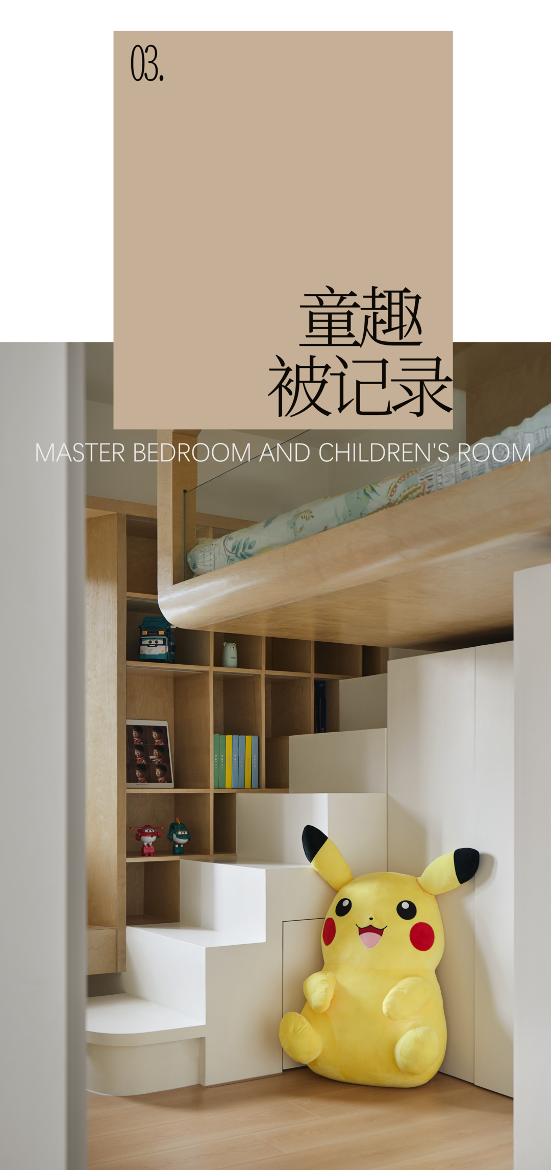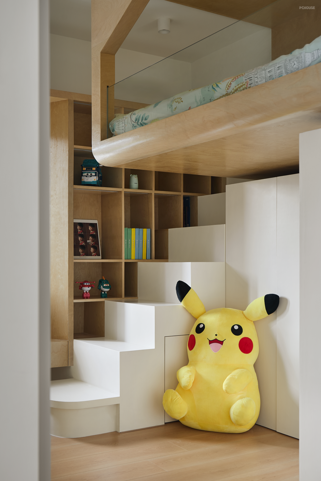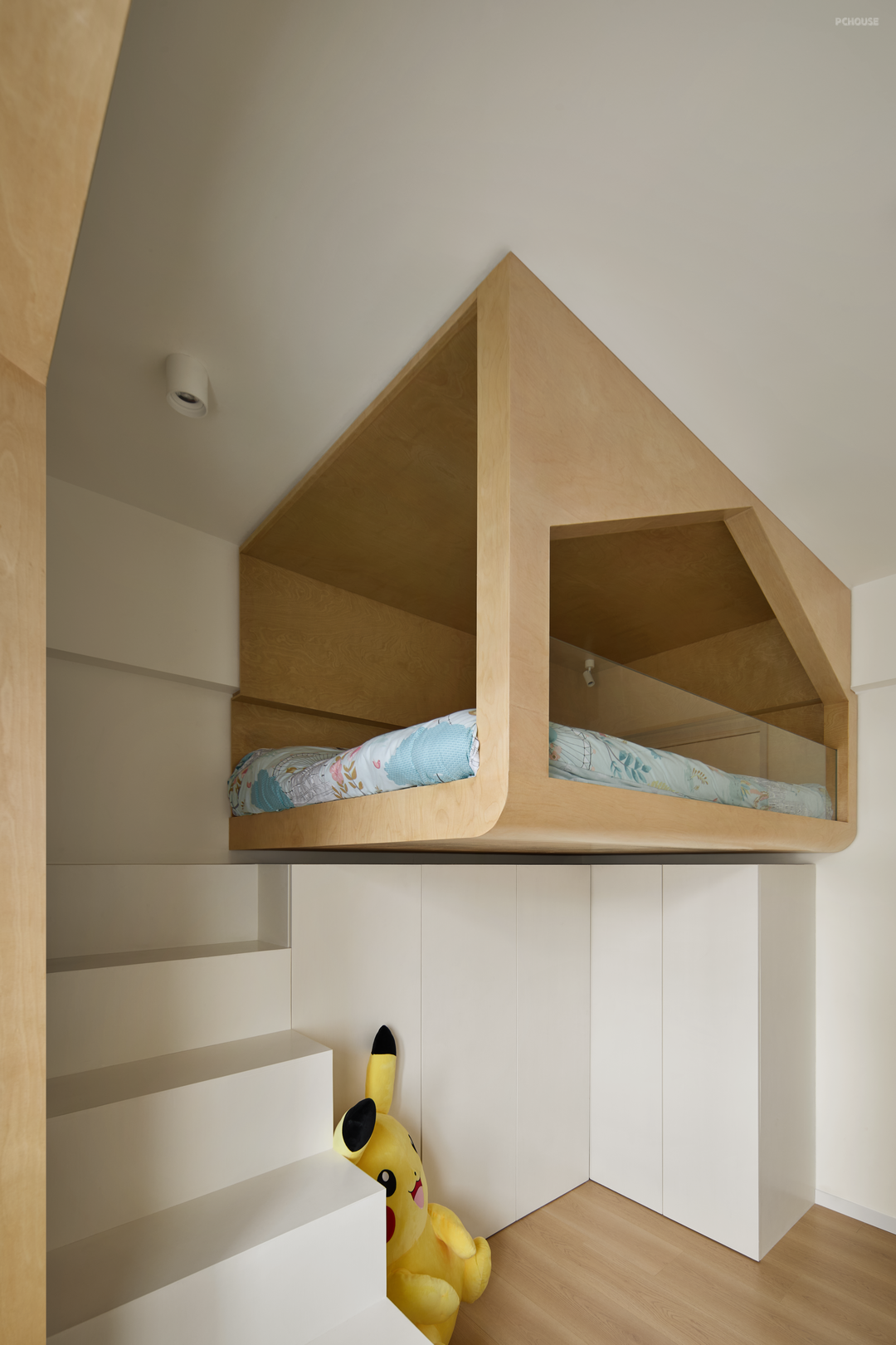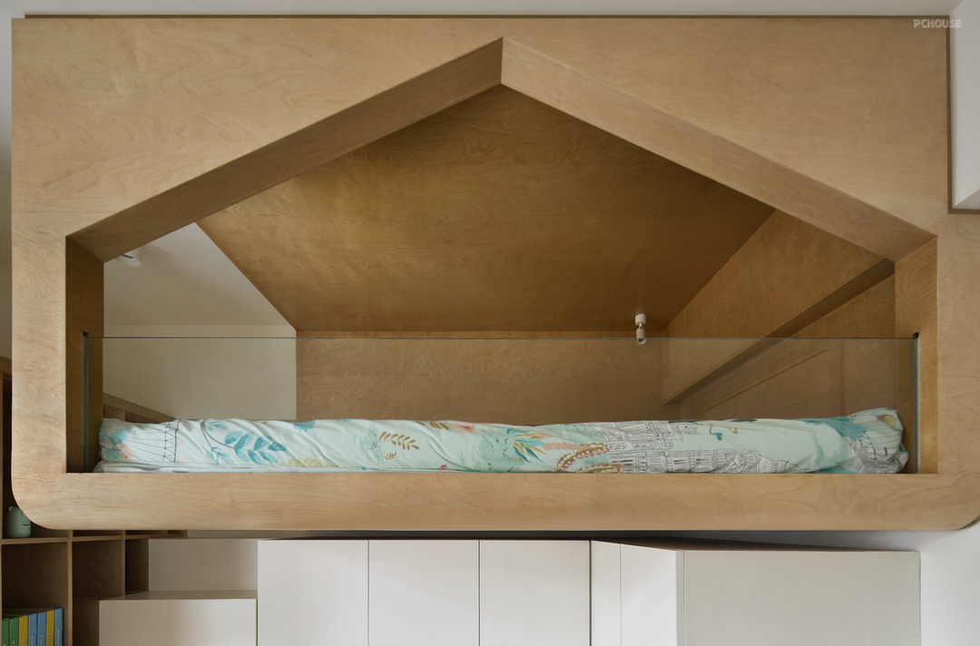 悬浮树屋的底部是小朋友的衣帽间,一方天地解决了休息和收纳的问题,功能与个性兼具,重视孩子的成长需求才是最好的童年礼物。