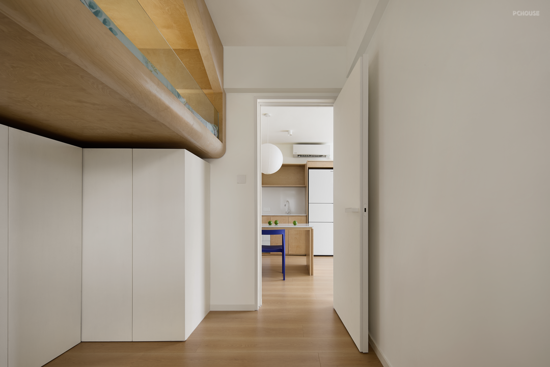 家政柜的高度与整体空间在同一个节奏线,家政柜旁两个隐形门的缝隙也设计在一个水平面,突显墙体的简洁流线和微妙起伏。